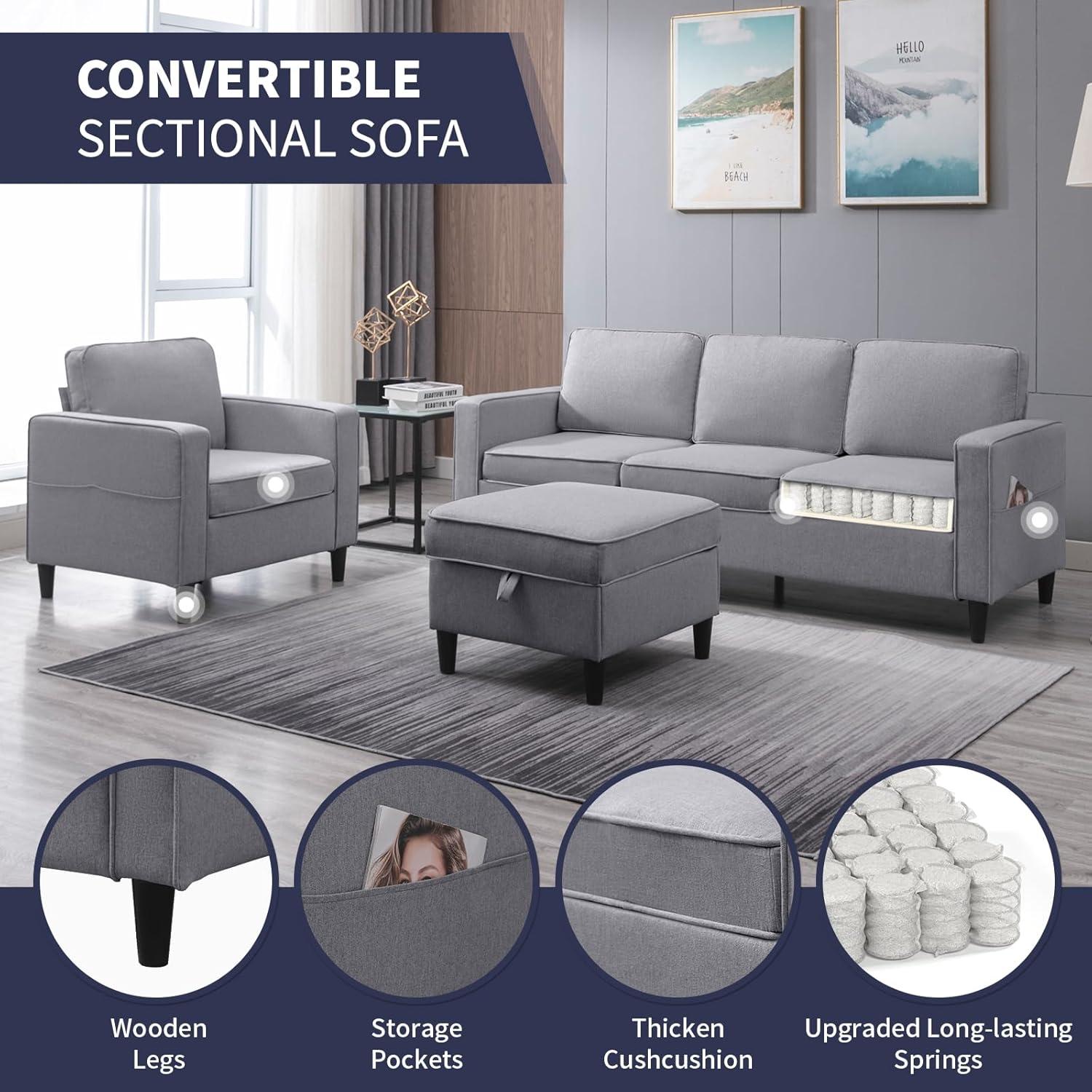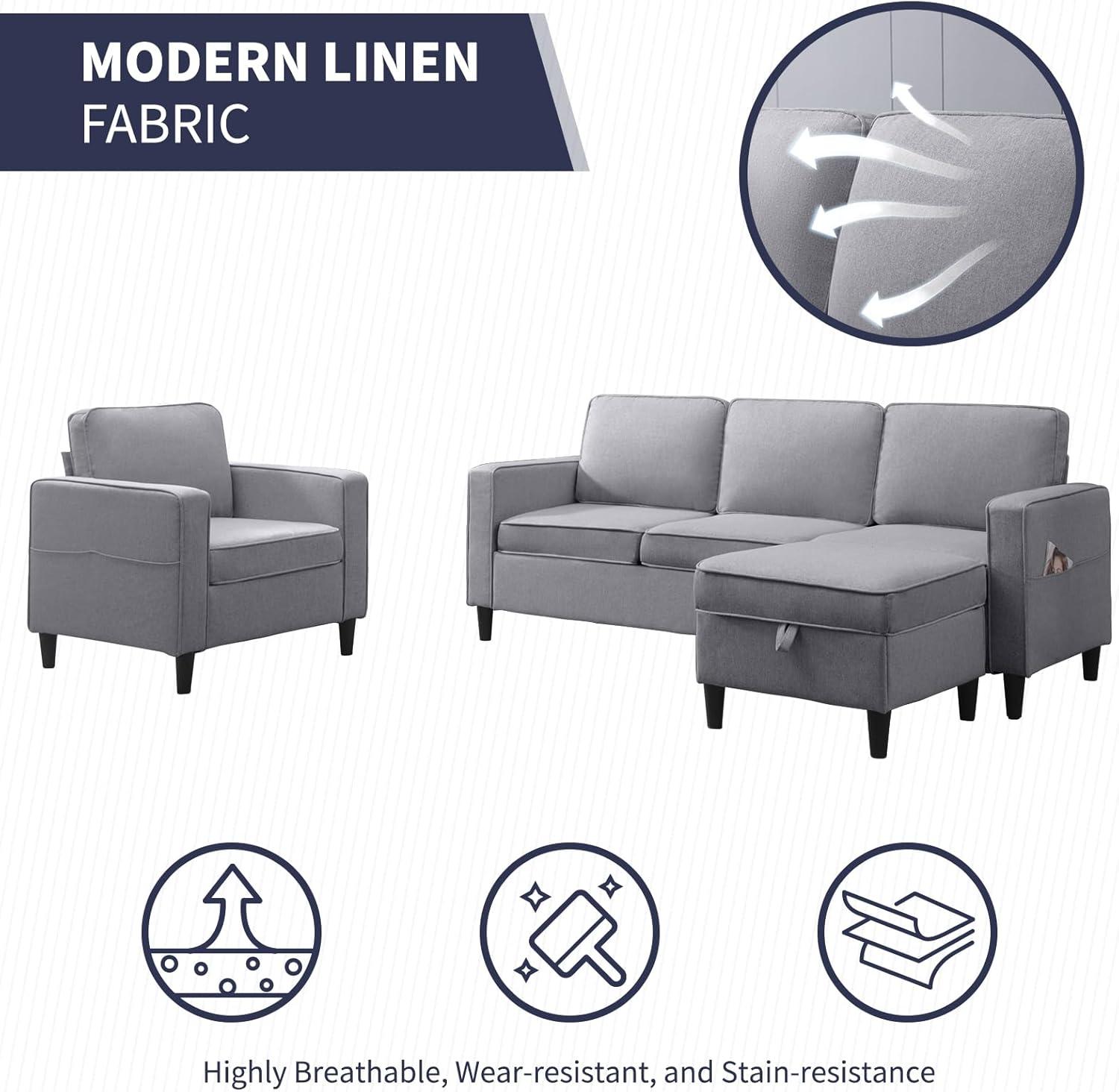 The sofa set has truly transformed our living room into a space that exudes modern elegance while prioritizing comfort. Its minimalist design and soft light grey linen fabric provide a timeless appeal that complements a variety of decor styles. What we appreciate most is the flexibility of the pieces-the movable ottoman and the armchair with integrated side pockets create a versatile layout. This adaptability allows us to optimize our seating arrangement depending on the occasion,whether entertaining guests or relaxing quietly. The breathable fabric and premium cushioning filled with high-quality sponge and upgraded springs ensure prolonged comfort without compromising on the sleek silhouette.
