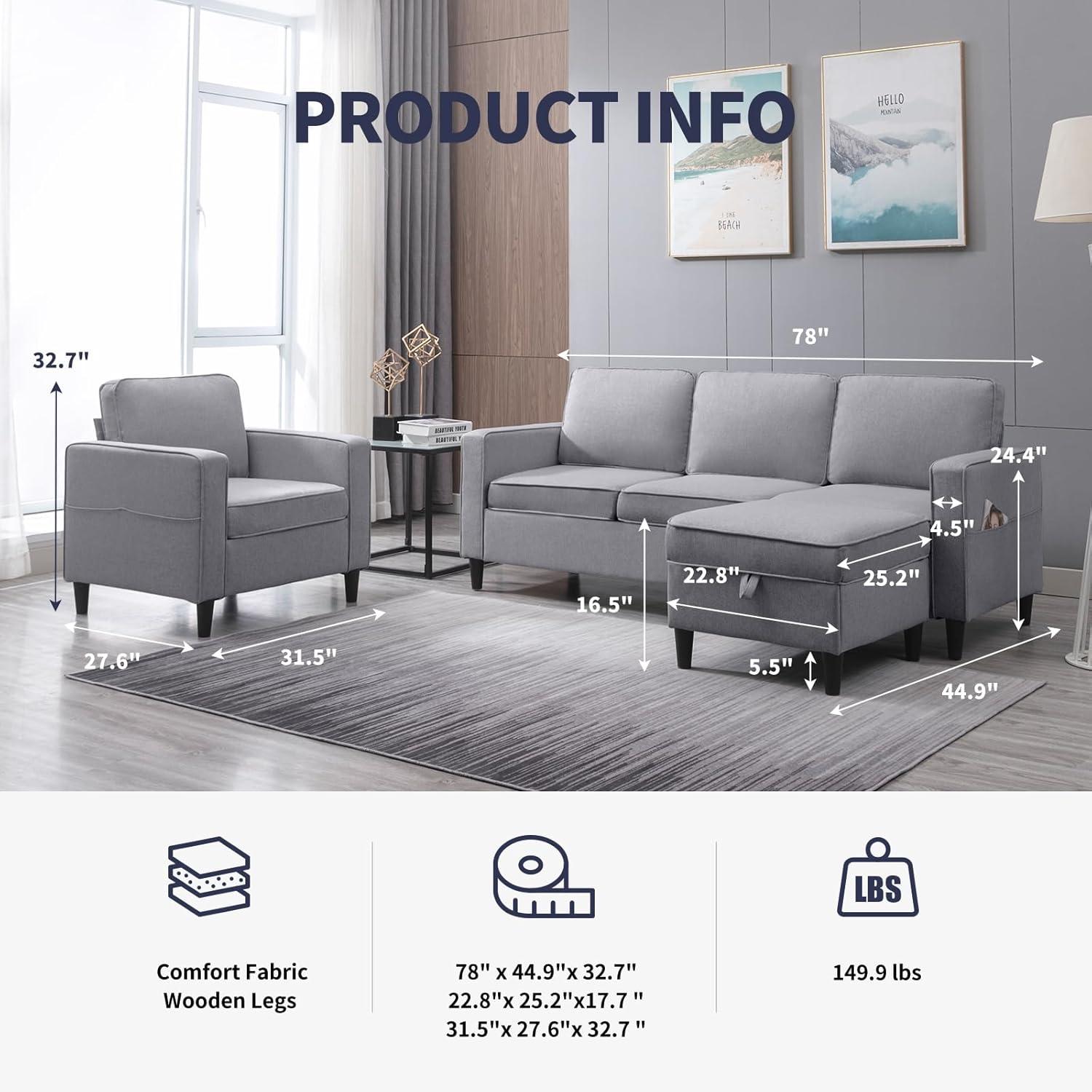 This sectional sofa set impresses with its modern minimalist design and thoughtful versatility.Comprised of a 3-seat couch and a separate armchair with a movable ottoman, it allows us to arrange our living area freely according to our needs. The included side pockets cleverly increase storage options, perfect for tucking away magazines, remotes, or other small essentials. Additionally, the ottoman doubles as a handy storage space, helping to maintain a clutter-free surroundings, especially in smaller rooms.