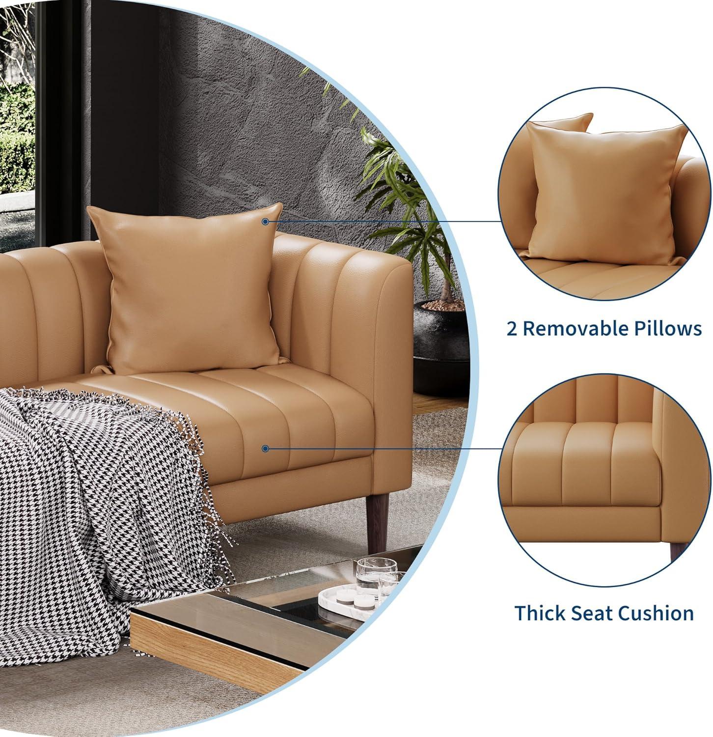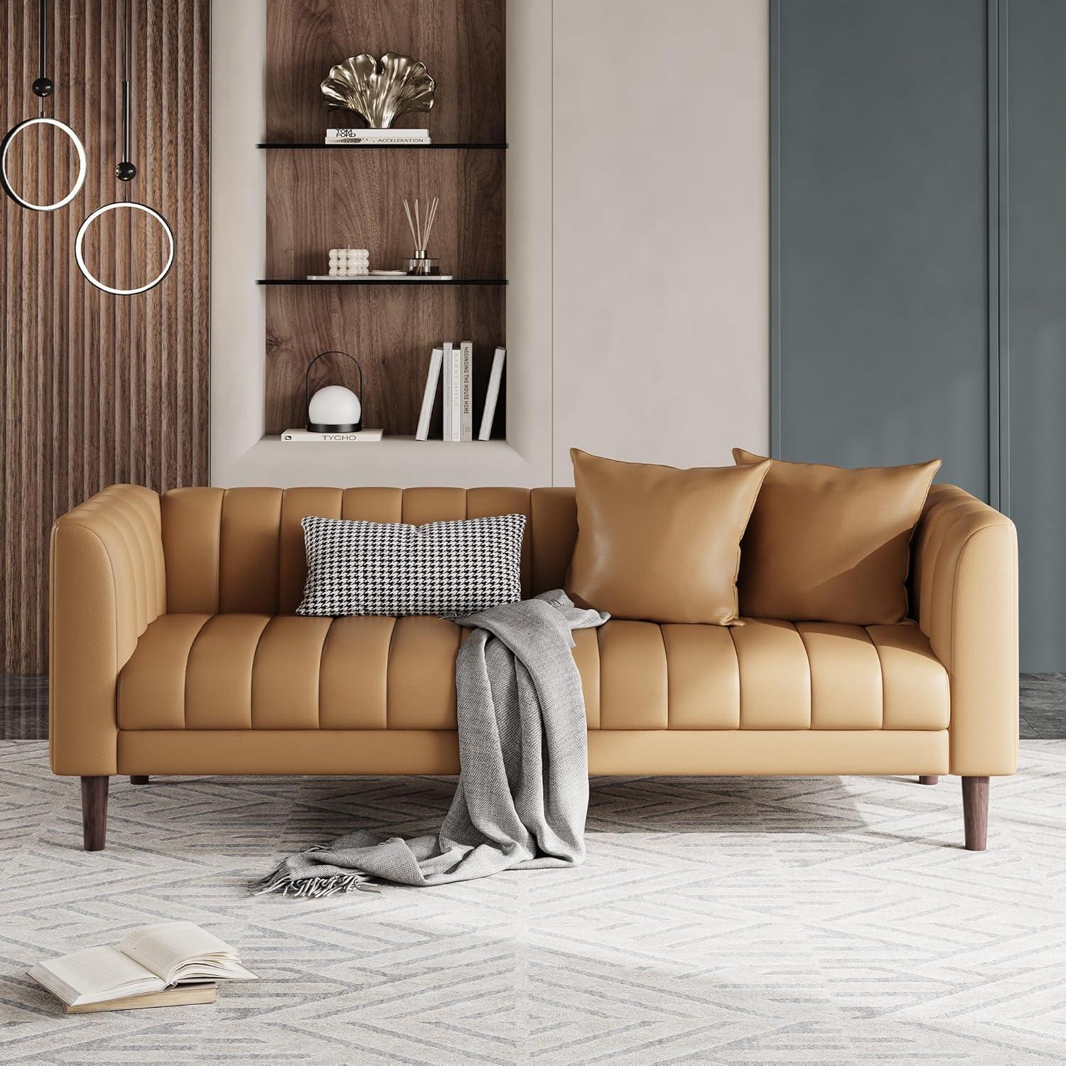 When you live with the GarveeHome Faux Leather Sofa Couch, Modern 78 in W Sofa with Deep Seats, 3 Seater Sofa Couch with 2 Throw Pillows and Wood Legs, Easy Assembly, for Living room, Bedroom, Brown, it settles into a corner of daily life rather than announcing itself. Over time you notice the seats soften with use,faint creases form on the surface,and the way it invites certain habits — where you sit,where things are set down — becomes part of how the room is used. In daily routines it holds a folded blanket, hosts quick phone calls, and quietly shapes the flow of people and small moments. After a while it simply rests.