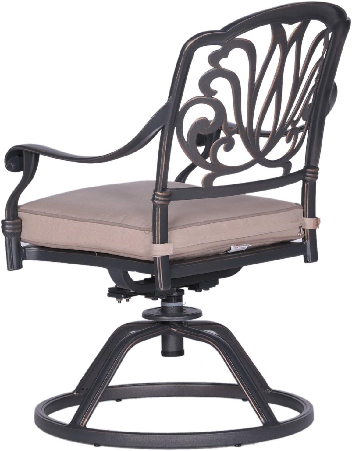 We were notably impressed by the seating comfort offered by the cushioned swivel rocker chairs. Each chair is equipped with quick-dry cushions featuring open-cell foam cores and removable covers,which not only provide plush support but also make maintenance effortless.The gentle rocking motion adds a soothing touch that encourages relaxation, turning every meal or gathering into a cozy, leisurely experience. The all-weather fabric ensures durability while maintaining a soft texture against the skin, so comfort is never sacrificed irrespective of the elements.