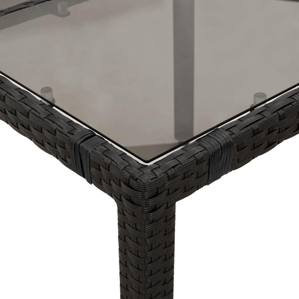 the combination of synthetic poly rattan and tempered glass creates a durable and visually appealing foundation for this outdoor dining set. The matte finish on the black poly rattan adds a contemporary touch while providing a sturdy frame resistant to everyday wear.Poly rattan’s adaptability and resilience make it ideal for outdoor furniture, as it withstands bending and pressure without cracking. Tempered glass offers a smooth, easy-to-clean surface that complements the woven texture, enhancing the overall aesthetic without compromising functionality.