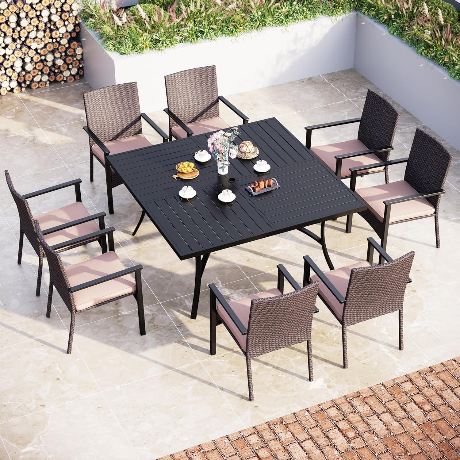 After spending considerable time evaluating this outdoor dining set, we appreciate its blend of practicality and style. The spacious square table comfortably accommodates up to eight people, making it ideal for family dinners or entertaining guests. The rust-resistant metal surface and weather-proof cushions make maintenance a breeze, while the ergonomic rattan chairs offer a surprising level of comfort for outdoor seating. Assembly is straightforward, with clear instructions and all necessary hardware included, which significantly reduces setup stress.