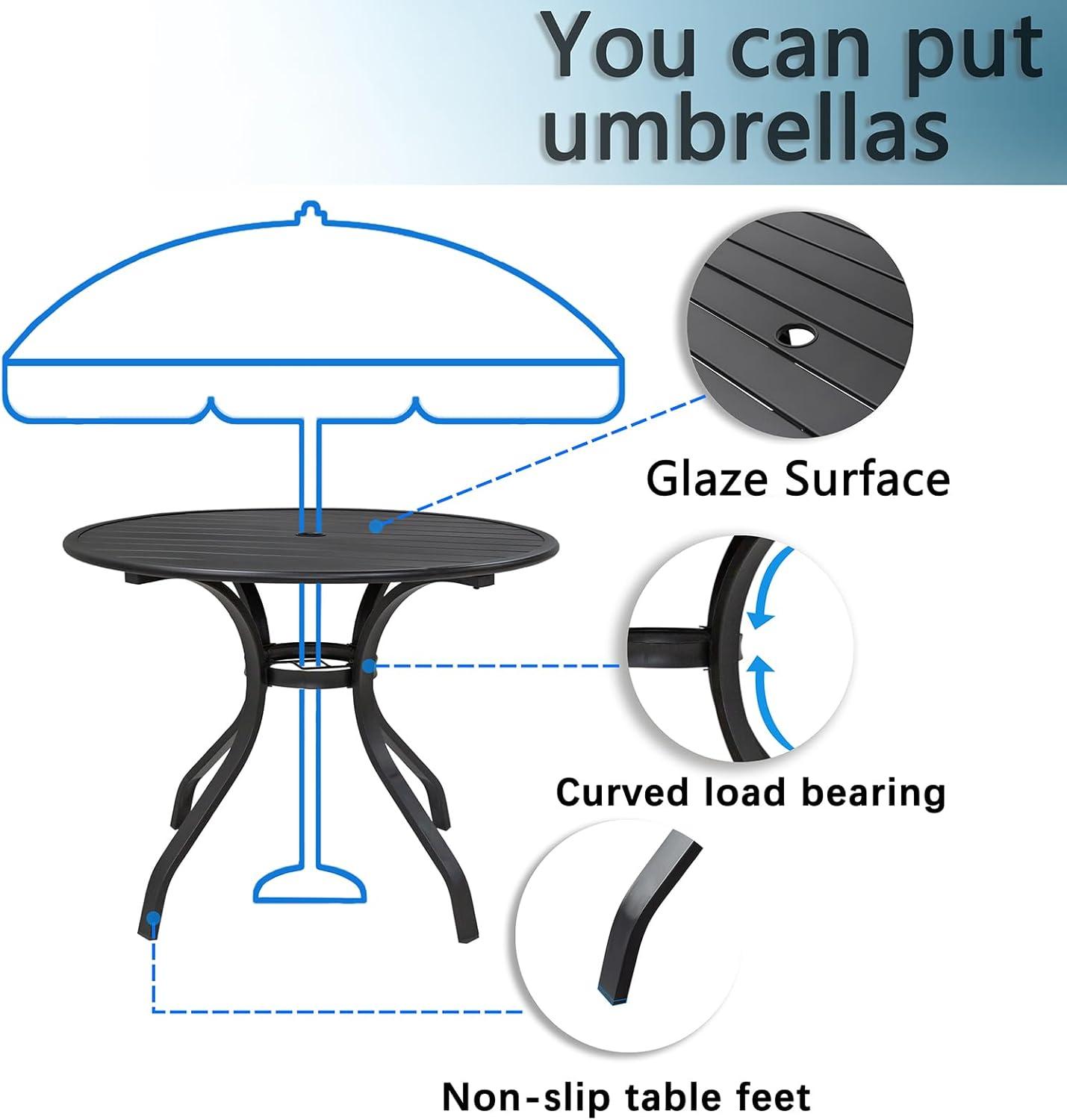 We found this dining set adaptable to various outdoor environments, whether on a narrow balcony, a spacious backyard, a cozy porch, or a deck. the compact 38-inch round table paired with four wide,comfortable chairs makes it convenient to fit even smaller spaces without feeling cramped. The metal slatted tabletop allows for secure placement on uneven surfaces, and the 1.5″ umbrella hole adds versatility for sun protection in open areas. its rust-resistant wrought iron frame with powder coating means it holds up well against the elements, which is a major plus for balconies and decks where weather exposure can vary.