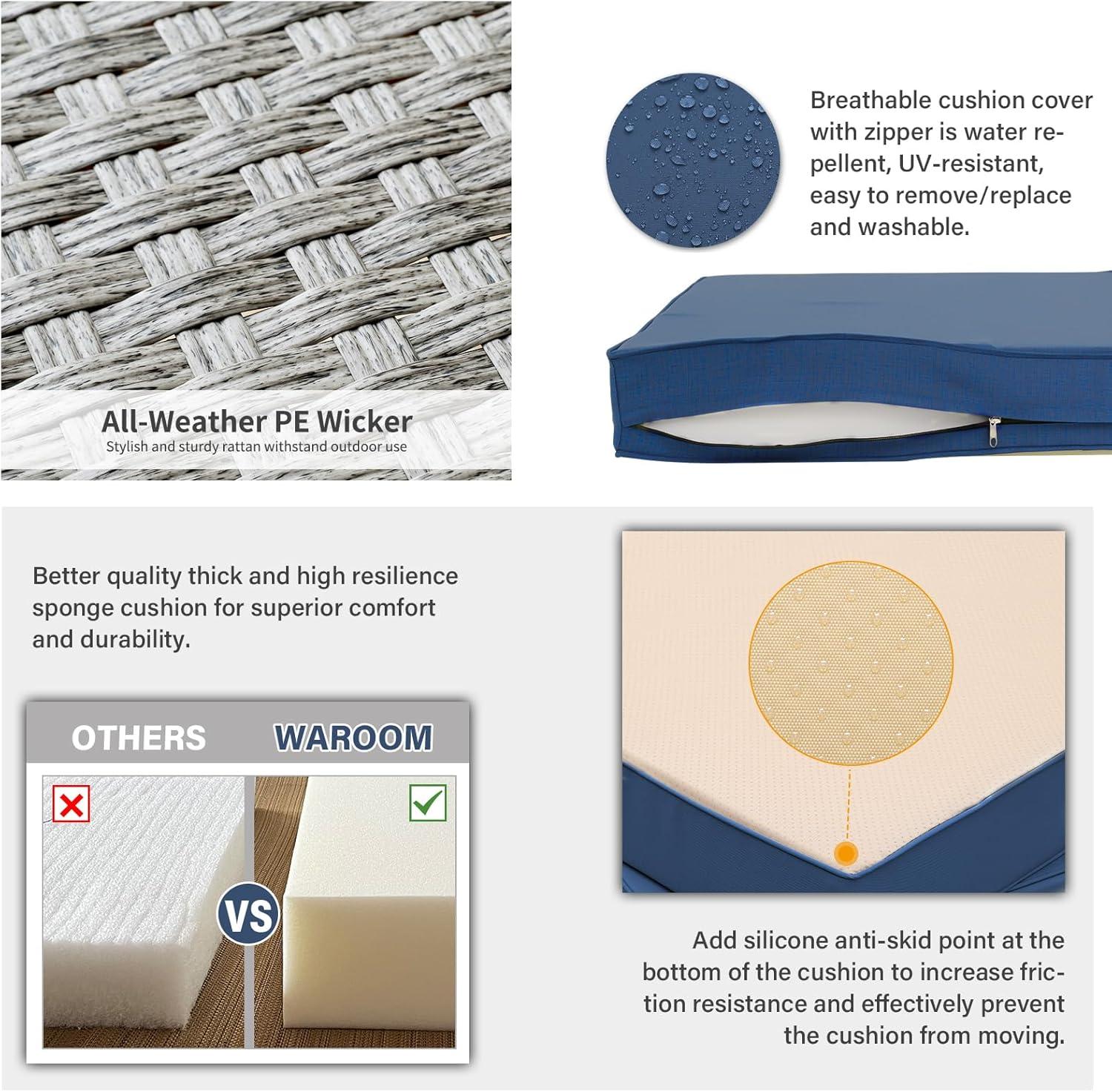 As for the style, the vibrant blue cushions bring a refreshing burst of color that contrasts elegantly with the grey wicker frame. Their sleek, modern palette fits effortlessly into diverse outdoor settings-be it a cozy porch or a lively backyard party spot. The cushion covers come with discreet zippers,making removal and cleaning hassle-free,which adds to their practicality. Below, we’ve summarized their key features:
