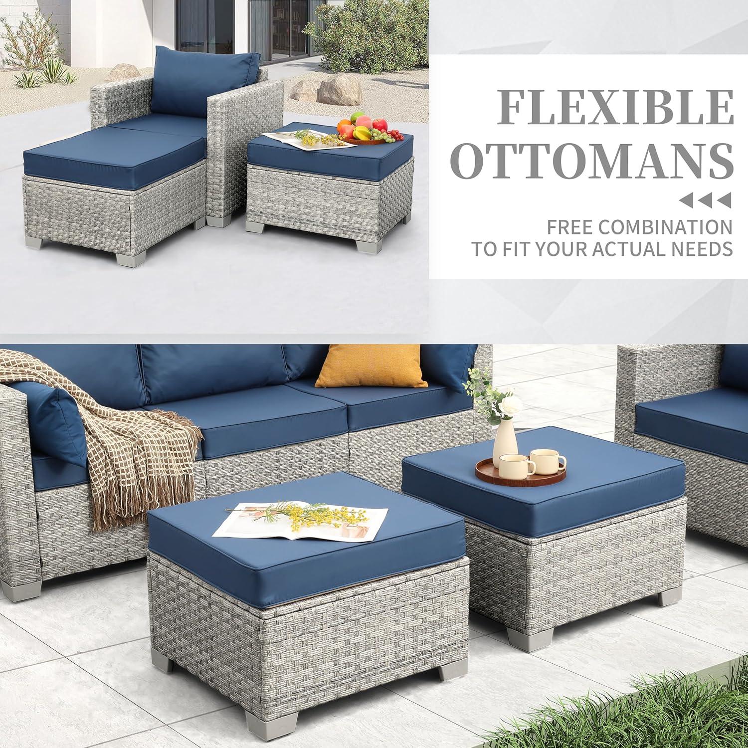Unpacking this 6-piece outdoor sectional set, we were immediately struck by its sleek, modern design and thoughtful construction.The combination of sturdy, rust-resistant steel framing and high-quality PE rattan weaves gives it a durable but elegant appearance, perfect for elevating any outdoor space. The deep blue cushions are not only visually appealing but also filled with a 4-inch thick high resilience sponge, delivering a remarkable level of comfort. Each cushion cover is made from breathable fabric thatS wear-resistant, water repellent, UV-resistant, and features zippers for easy cleaning, making them practical and also plush.