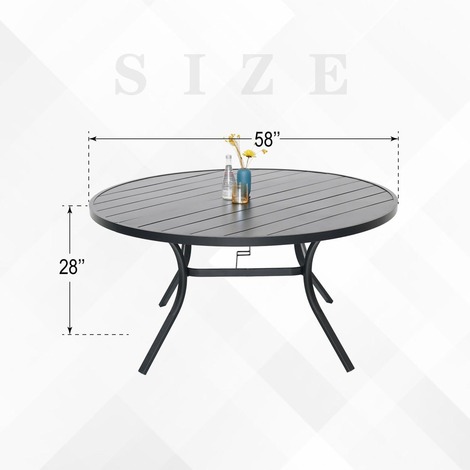 From our hands-on experience,the table impresses with its robust steel construction combined with a high-quality e-coating finish.This coating not only adds a sleek black aesthetic but also serves as a strong protective layer against rust and weather elements, making it truly suitable for extended outdoor use. The 58-inch diameter offers ample space for dining and entertaining, while the solid 28-inch height provides comfortable seating alignment with the accompanying chairs. The steel material ensures a steady and stable feel under normal use, giving us confidence that this table is built to withstand various weather conditions and regular family gatherings.