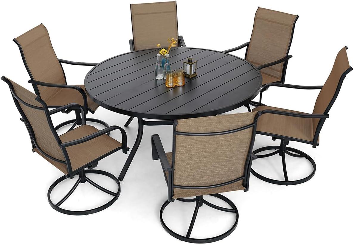 From the moment we assembled this outdoor dining set, the quality and thoughtful design stood out. The large round table, measuring 58 inches in diameter and standing 28 inches tall, provides ample space for entertaining guests or enjoying family meals. Its sleek black steel frame with an e-coated surface ensures durability and resistance to rust, wich has been especially reassuring given our exposure to various weather conditions. The six high-back swivel chairs in vibrant yellow not only add a cheerful pop of color but also offer excellent comfort with their breathable textilene mesh fabric, perfect for warm afternoons and quick drying after a rain shower.