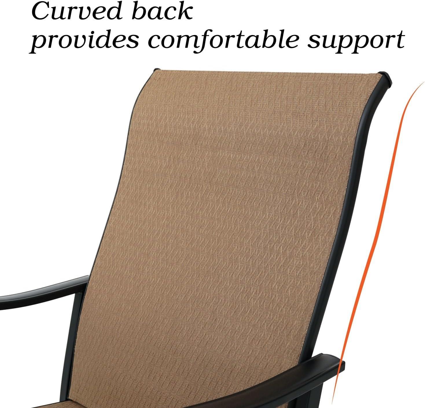 Besides comfort, the armrests’ cambered shape provides practical benefits. They allow us to easily swivel in the chairs without feeling cramped or unstable, giving us the freedom to engage with others or reach for items on the generously sized 58-inch table without repositioning awkwardly. Coupled with the breathable mesh fabric and weather-resistant materials, this design delivers exceptional support and durability, making every outdoor moment more enjoyable.