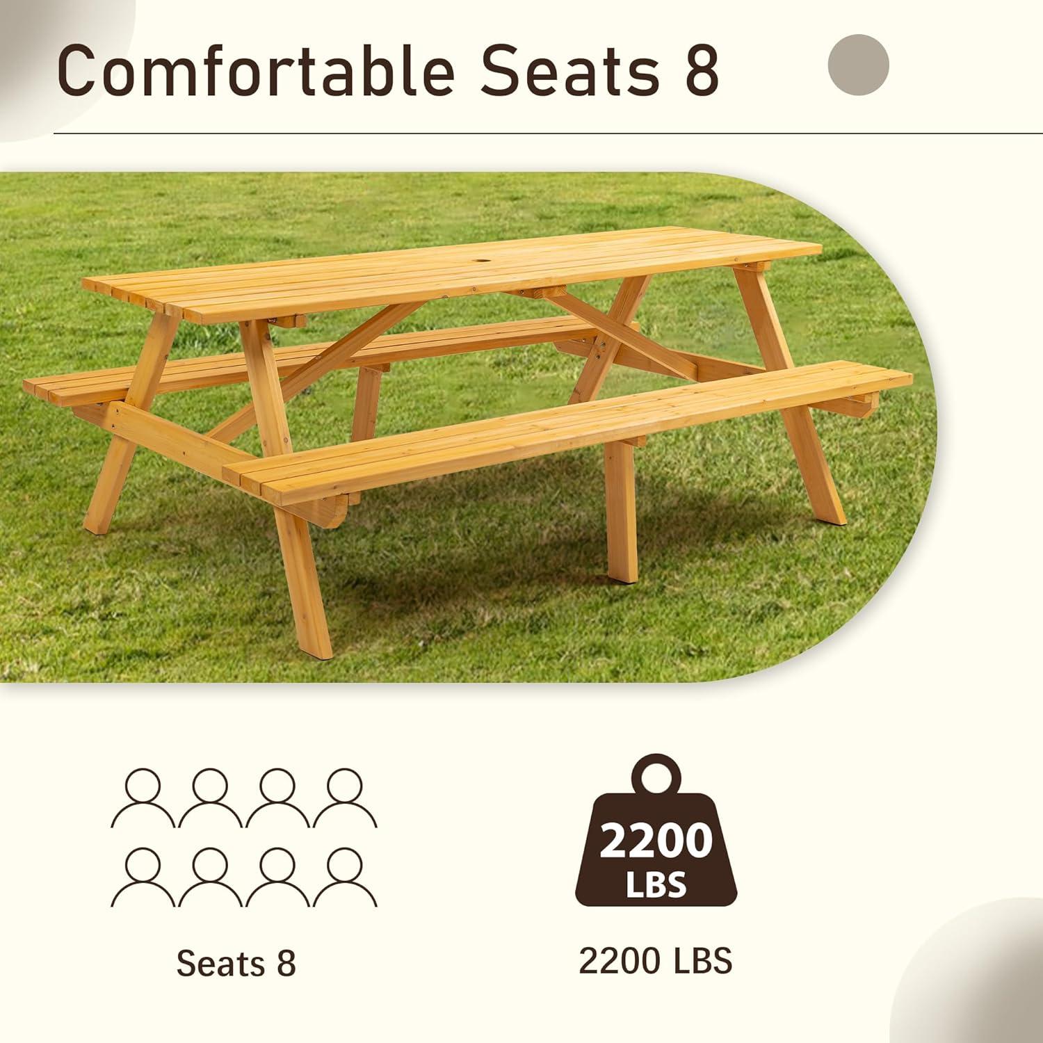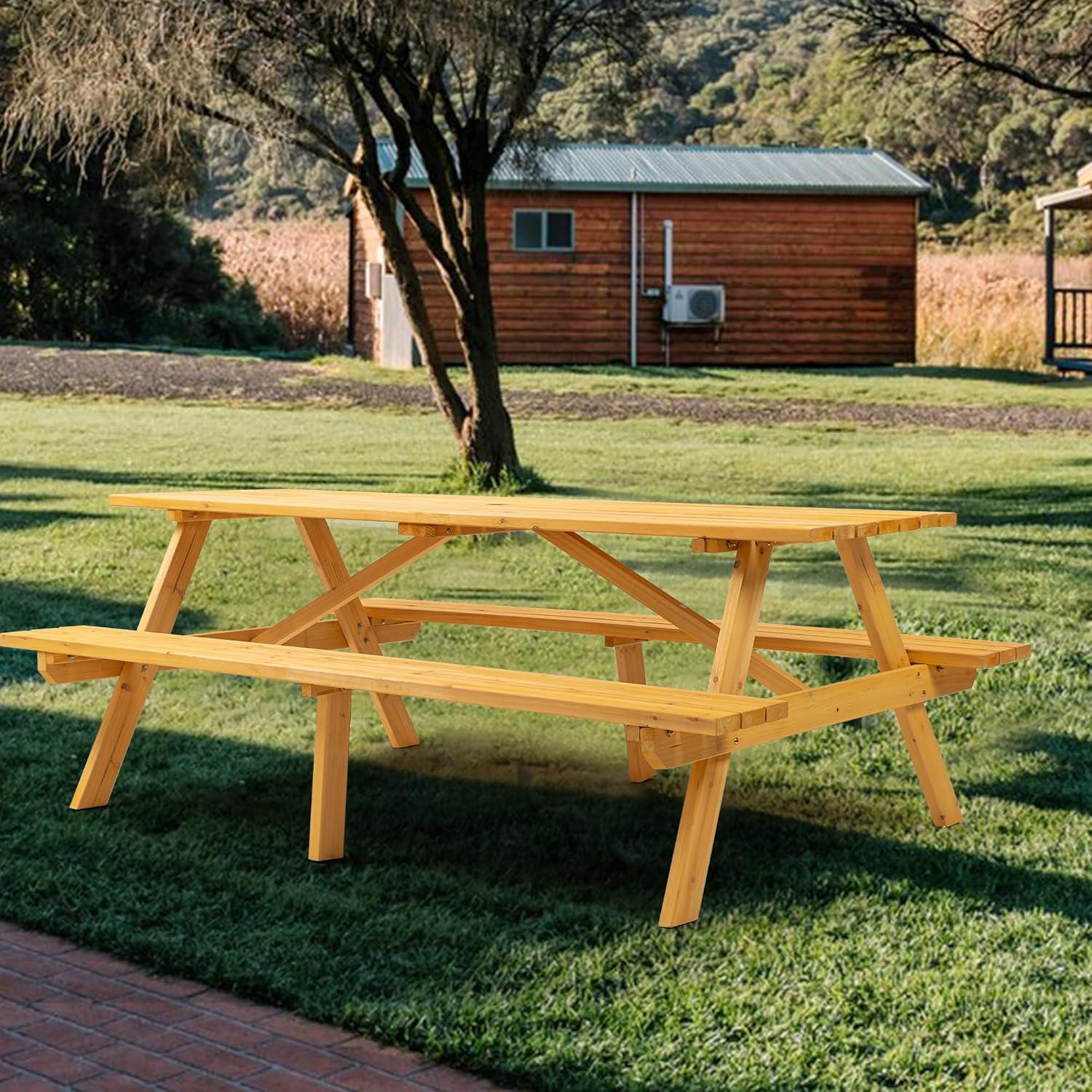 We found this outdoor wooden picnic table to be a perfect blend of functionality and style.The integrated benches on both sides create a seamless dining experience while saving space, making it ideal for our patio and garden. Its solid fir wood construction feels sturdy under pressure, though we made sure to avoid placing overly heavy objects to prevent any tipping concerns. The table comfortably seats eight people, allowing our family and friends to gather without feeling crowded, which has truly enhanced our outdoor get-togethers.