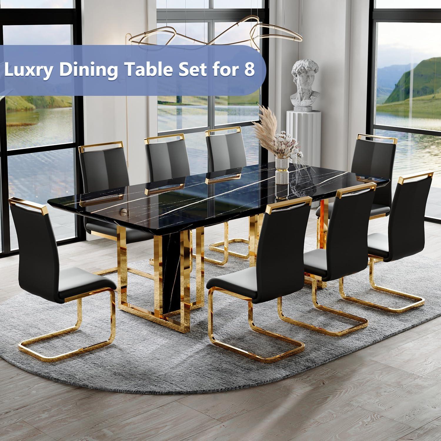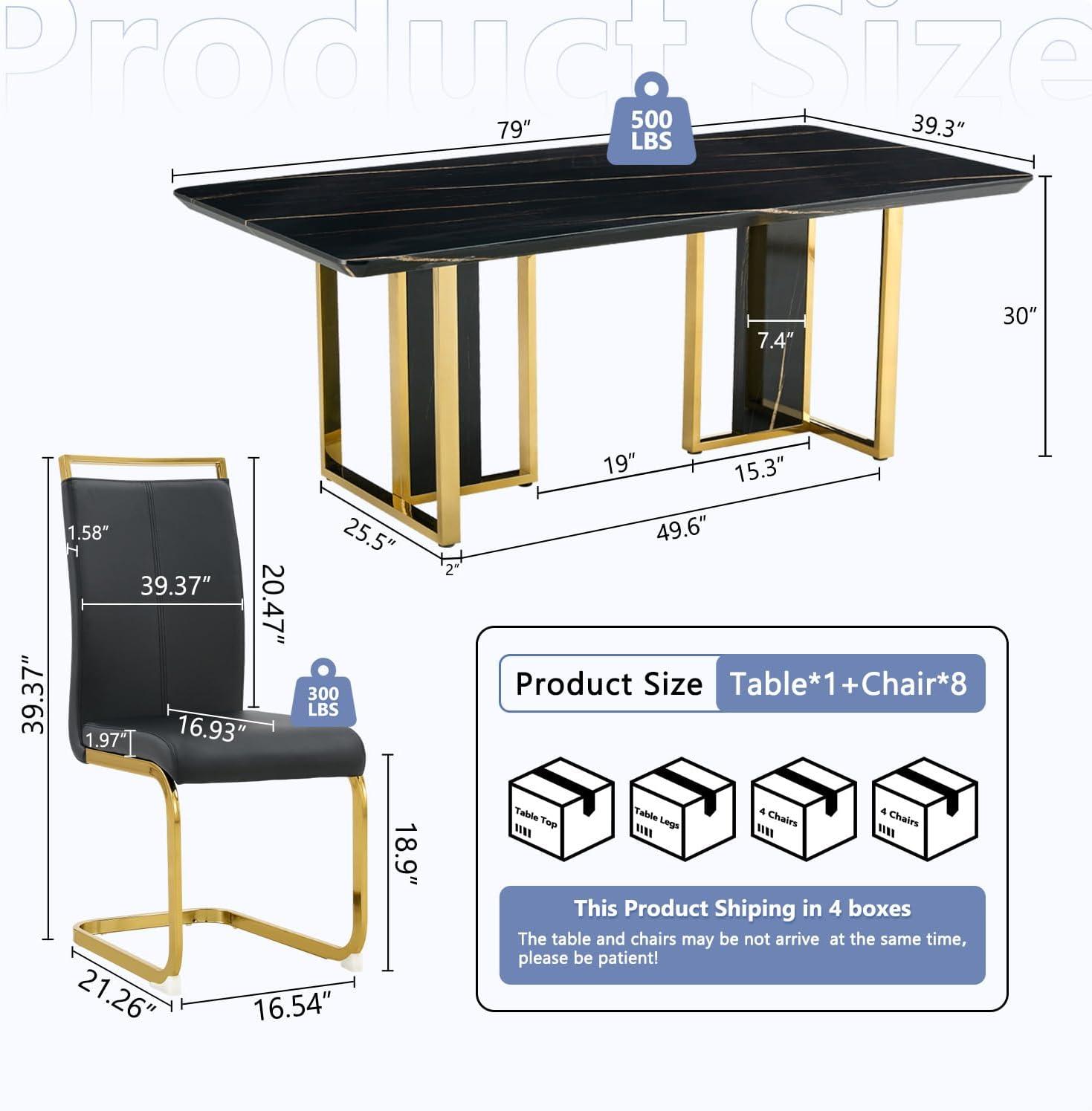 Our experience with this dining set has been truly notable, especially when hosting larger groups. The 79-inch glossy faux marble tabletop offers ample space, comfortably seating eight guests without crowding. Its sleek, black rectangular design gives the room a refined vibe, perfect for formal dinners or casual get-togethers. The T-shaped stainless steel legs provide an undeniably sturdy foundation-no wobbling or instability, just solid support for every occasion. We appreciate how the chairs complement the table perfectly, blending modern aesthetics with ergonomic comfort.