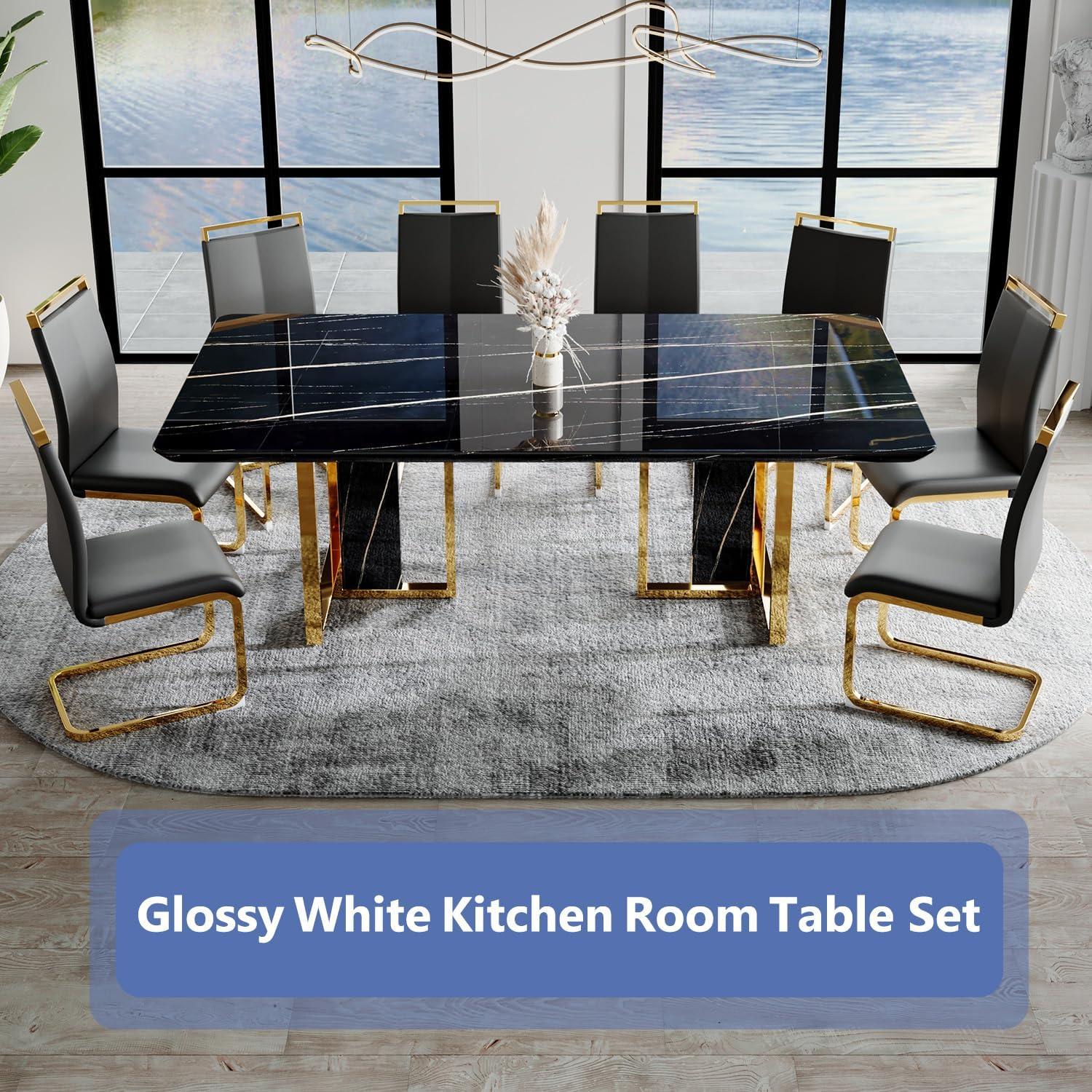 Our dining table set’s glossy faux marble top and sleek black rectangular design effortlessly elevate any dining area, making it the perfect match for modern and contemporary interiors.The clean lines and shiny surface create a sophisticated vibe, ideal for minimalist spaces where elegance meets practicality. To highlight its refined aesthetic, consider pairing it with neutral tones, matte finishes, and metallic accents such as stainless steel or brushed nickel. Open-concept kitchens or dining rooms with ample natural light will allow the tabletop’s glossy texture to become a stunning focal point during meals and gatherings.