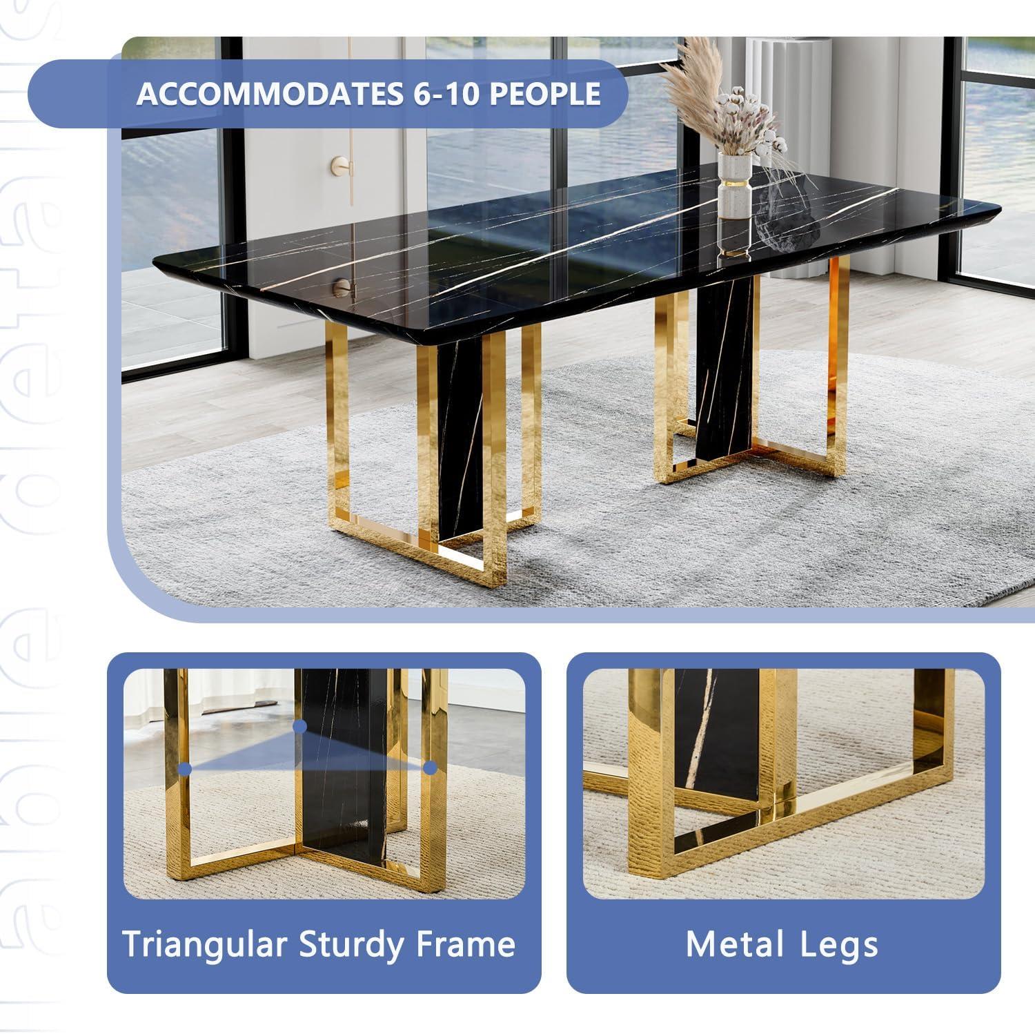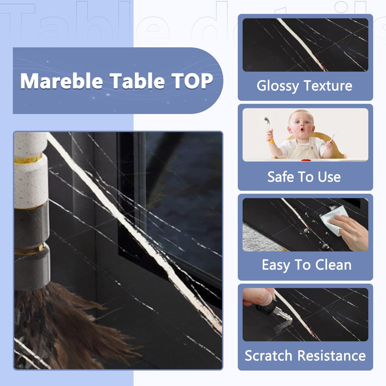 From the moment we unpacked the pieces, the sleek black rectangular frame caught our eyes with its refined edge lines that seamlessly blend modern minimalism with high-end appeal. The glossy faux marble tabletop really elevates the overall aesthetic, creating a luxurious sheen without the weight or maintenance of real marble. What impressed us most was the solid feel; supported by T-shaped stainless steel legs, the entire setup exudes robustness, giving us confidence that it will withstand family meals and social gatherings without wobbling or instability.