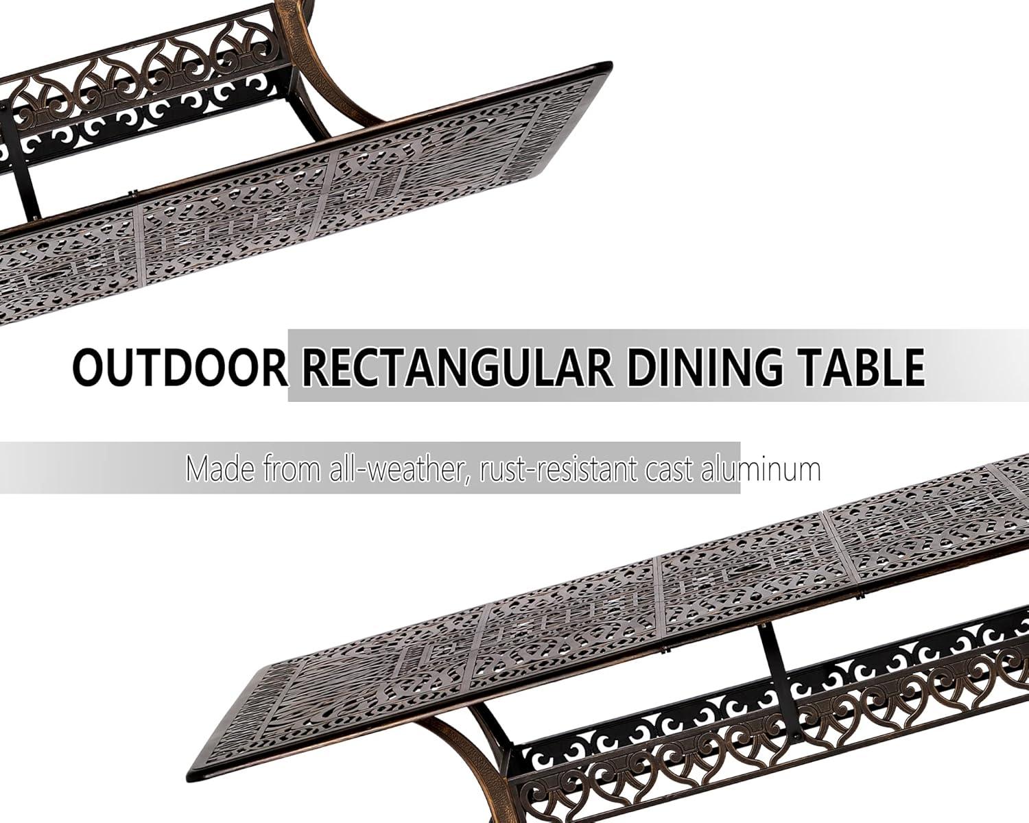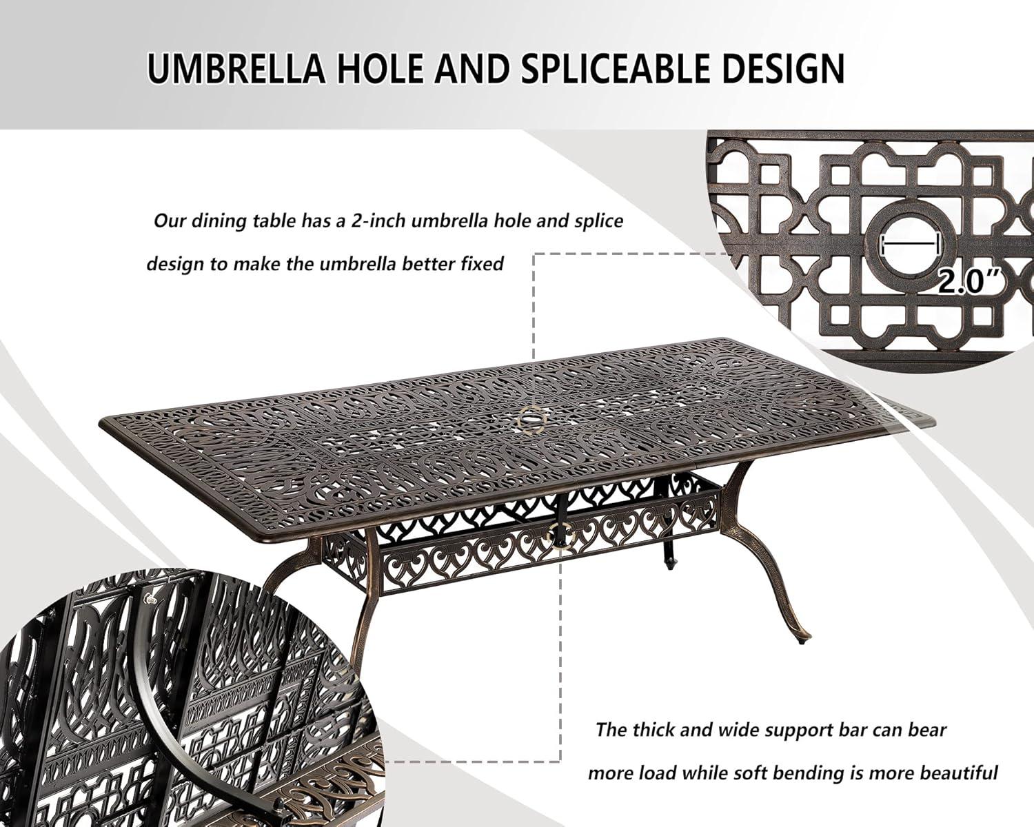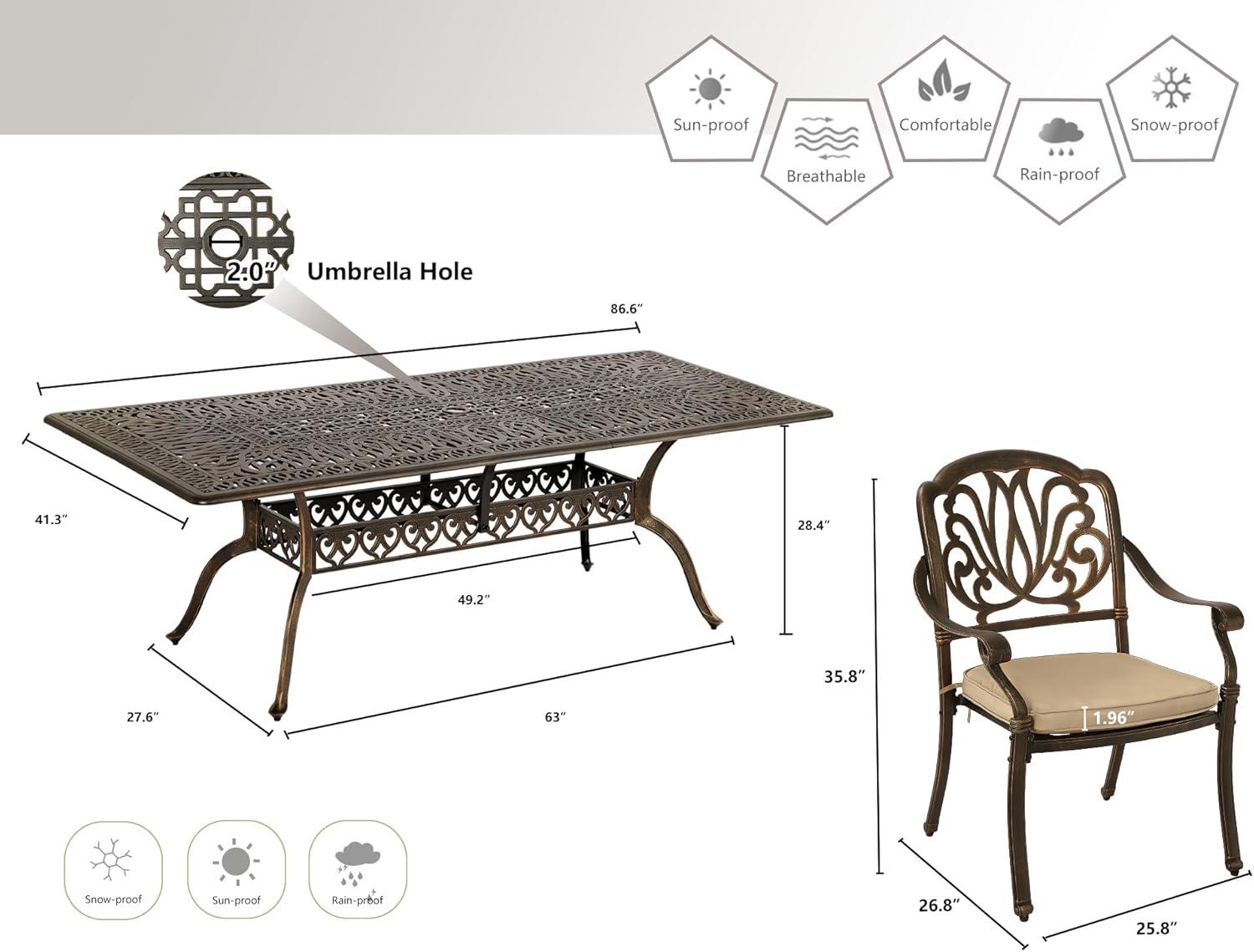 Bringing this dining set into our outdoor space has truly elevated the atmosphere of our backyard and garden, transforming it into a welcoming retreat. The cast aluminum construction with its rust-resistant powder coating not only promises durability but also adds a sleek, contemporary look that seamlessly blends with natural surroundings. The roomy rectangular table comfortably seats eight, making it perfect for gatherings, while the built-in umbrella hole ensures we stay cool and shaded during sunny afternoons-ideal for lingering meals or cozy evenings spending time with loved ones.