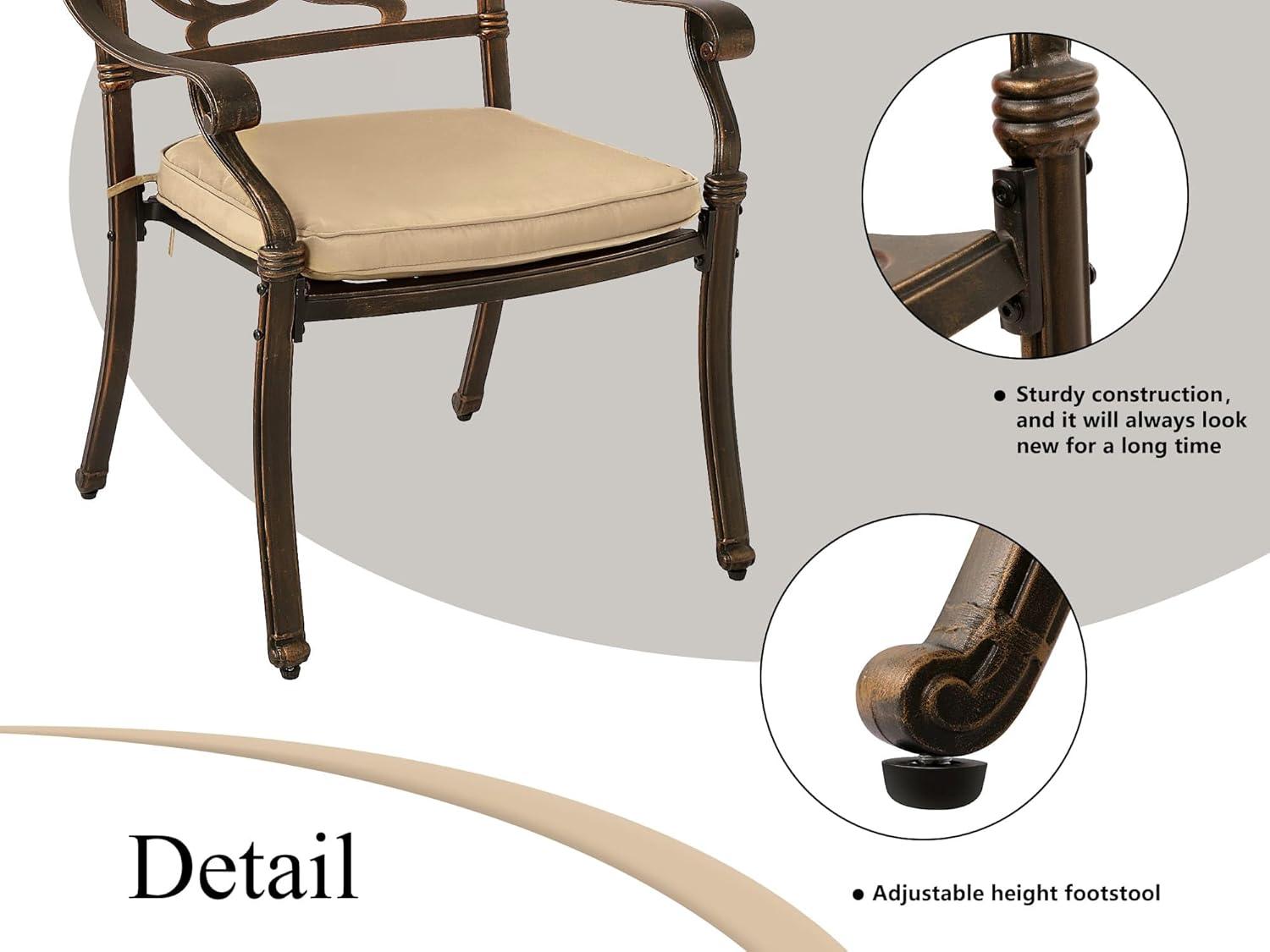 The chairs stand out with their ergonomic design-curved armrests, well-ventilated seating, and high backrests offer optimal support and relaxation. Each chair supports up to 300 pounds and remains stable thanks to adjustable feet that balance out uneven ground and protect flooring from scratches. The removable cushions, crafted from UV-resistant and waterproof fabric, contribute not only to comfort but also to easy maintenance. Altogether, this combination of sturdy cast aluminum and intelligent design choices promises a long-lasting, stylish outdoor dining experience.