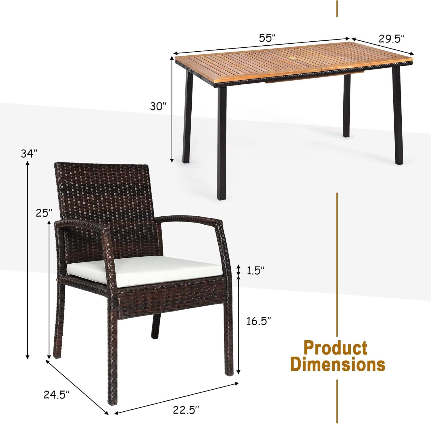 One of the standout features of this outdoor dining set is its versatility and thoughtful design, which makes it an ideal fit for a variety of outdoor settings. The solid acacia wood table top not only brings natural elegance but also offers a spacious surface perfect for meals, drinks, or entertaining guests. The inclusion of a 2-inch umbrella hole means you can easily add shade to your setup, providing comfort during sunny afternoons by the pool or in your garden. Thanks to the durable steel frame and weather-resistant PE rattan chairs, this set withstands the elements, maintaining both style and functionality over time. The classic rattan texture combined with neutral beige cushions blends seamlessly into greenery or poolside tile, enhancing any outdoor decor without dominating the space.