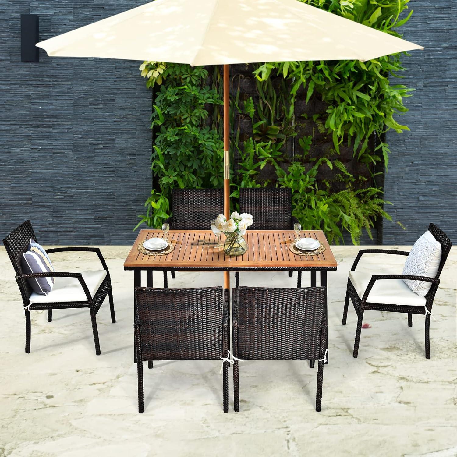 After spending time with this stylish seven-piece outdoor dining ensemble, it’s clear that it expertly balances elegance and functionality. The combination of a solid acacia wood tabletop and weather-resistant PE rattan chairs supported by a sturdy steel frame means it’s built to last through many seasons. Comfort hasn’t been overlooked either – the cushions offer just the right softness with ergonomic backrests that invite you to linger over long conversations or family meals.Plus, the integrated umbrella hole is a thoughtful addition, offering flexible sun protection without crowding your dining space.