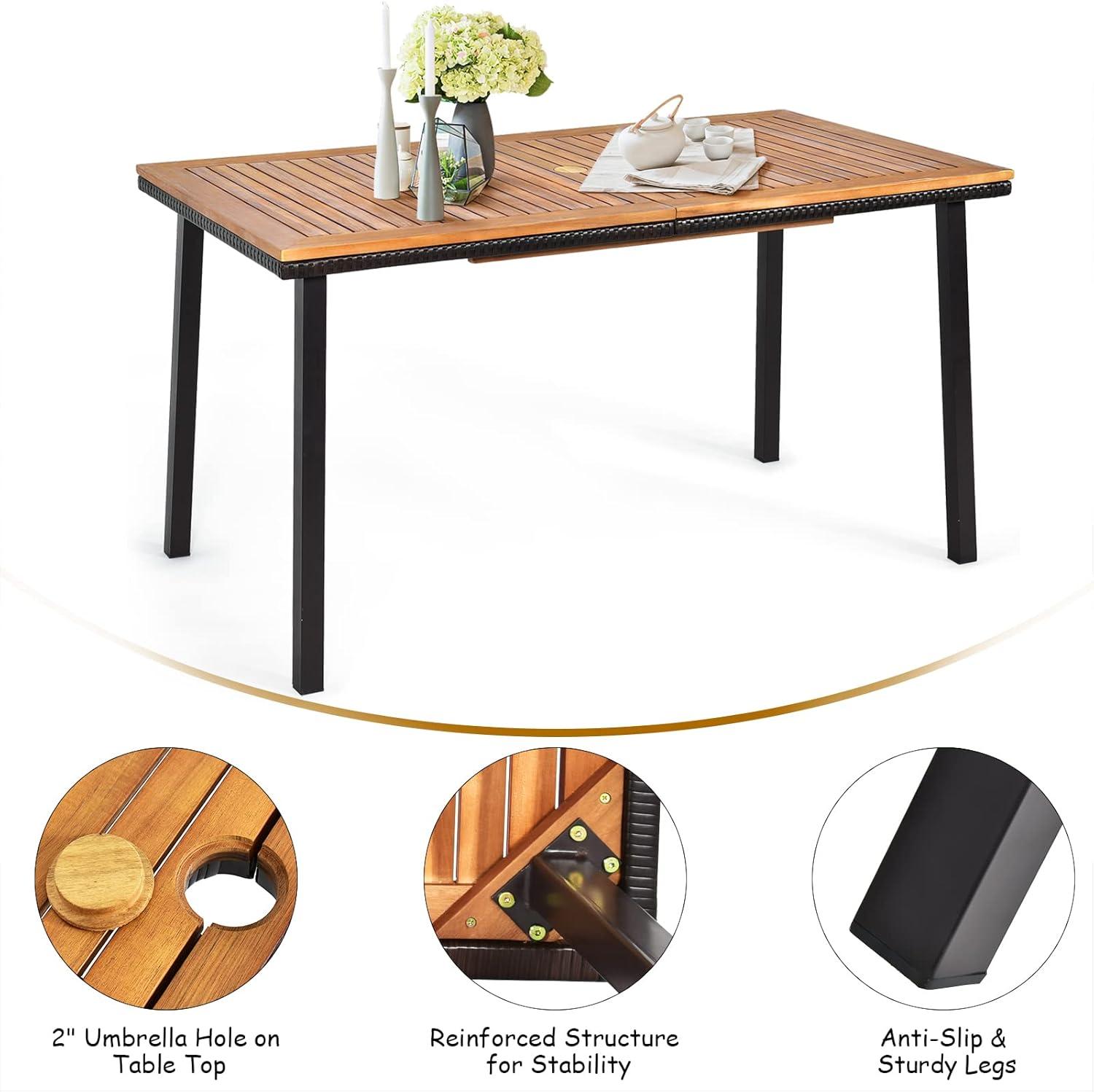 From the moment we set eyes on this outdoor dining set, the seamless fusion of natural textures and modern craftsmanship stood out. The rectangular table boasts a stunning acacia wood top, which not only brings warmth and richness to the aesthetic but also ensures excellent durability against outdoor elements. Its smooth finish is complemented by a 2-inch umbrella hole, thoughtfully designed to fit most umbrellas and provide practical shade during sunny days.Surrounding the table are six armrest chairs woven from high-quality PE rattan, offering a timeless look with remarkable weather resistance.The sturdy steel frames underpin both table and chairs, giving a reassuring stability that promises long-term use without compromising style.