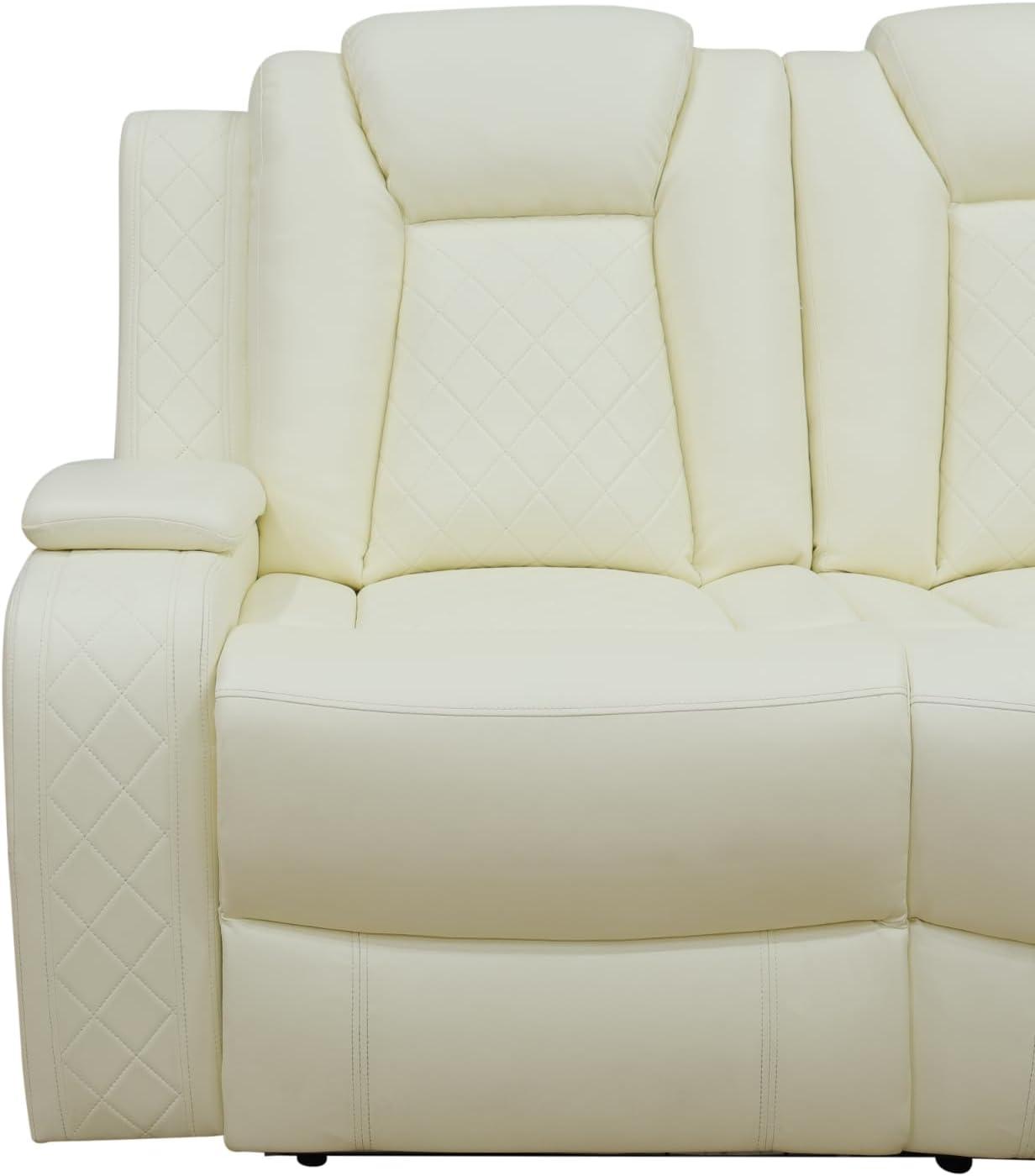 After a few weeks and then months of ordinary use, you notice how the Power Reclining Sofa Set, Living Room Furniture Set with USB Ports, Leather Recliner Couches Set for Living Room/Apartment/Office/Home Theater (Creamy White, Sofa) quiets its newness into a familiar presence. The way people sit — quick phone stretches, slow evening sinking, the habitual corner for a book — changes how the cushions soften and how the surface picks up small scuffs and creases. In daily routines it becomes less an object under inspection and more part of the room’s movement: a blanket folded on an arm, the remote habitually left in its crevice, sunlight tracing the leather across the day. Over time it simply stays.