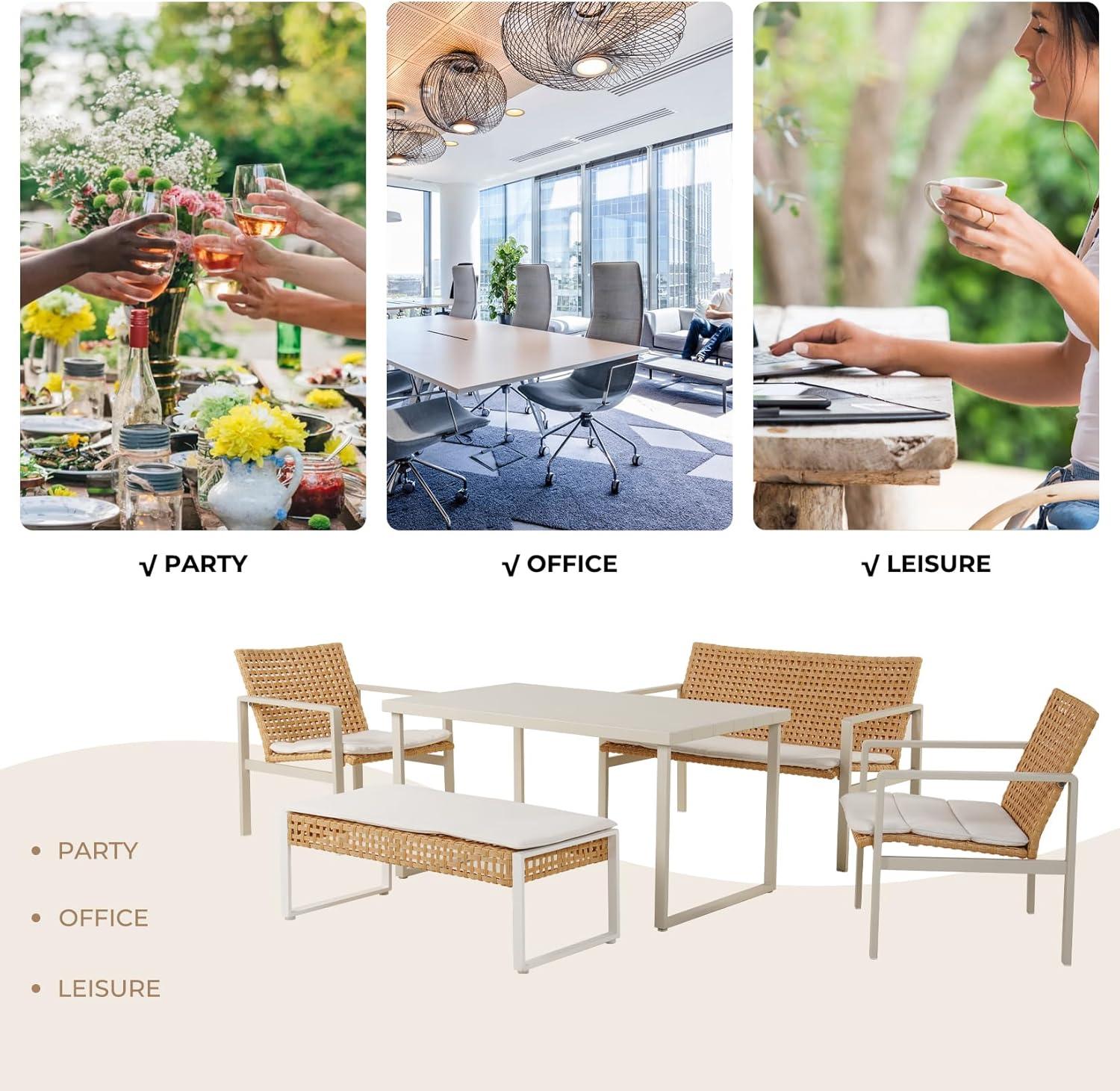 late afternoon sun pools across the wicker and the tabletop’s faint stripes pick up a soft gleam; you find yourself resting a hand on the weave before you realize it. The Grand patio 5-Piece Outdoor Dining Set arrived in one box, but laid out it reads simply — low, broad bench, chairs with a steady back, a table that doesn’t shout for attention. Up close the resin wicker yields a touch of spring under your fingers and the cushion fabric feels matte and slightly textured, the sort of surface that betrays everyday use in good ways. It settles into the yard with clean lines and a reassuring visual weight, more lived-in presence than staged centerpiece.