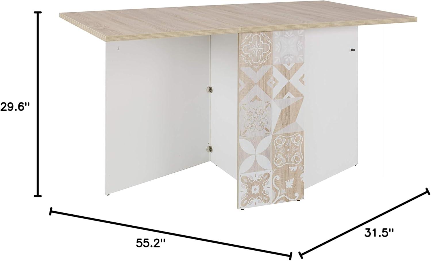We instantly appreciated the clever design and functionality that this folding dining table brings to smaller living spaces. Its light oak woodgrain paired with crisp white accents creates a soothing, contemporary vibe that effortlessly complements various décor styles. the patchwork stamp block pattern on the side panels adds a subtle visual interest, ensuring the table remains a standout piece even when folded.Perfectly sized for apartments, condos, or studios, this table easily transforms from a sleek console into a dining area with seating for 4-6 guests, making it ideal for intimate dinners and casual gatherings alike.