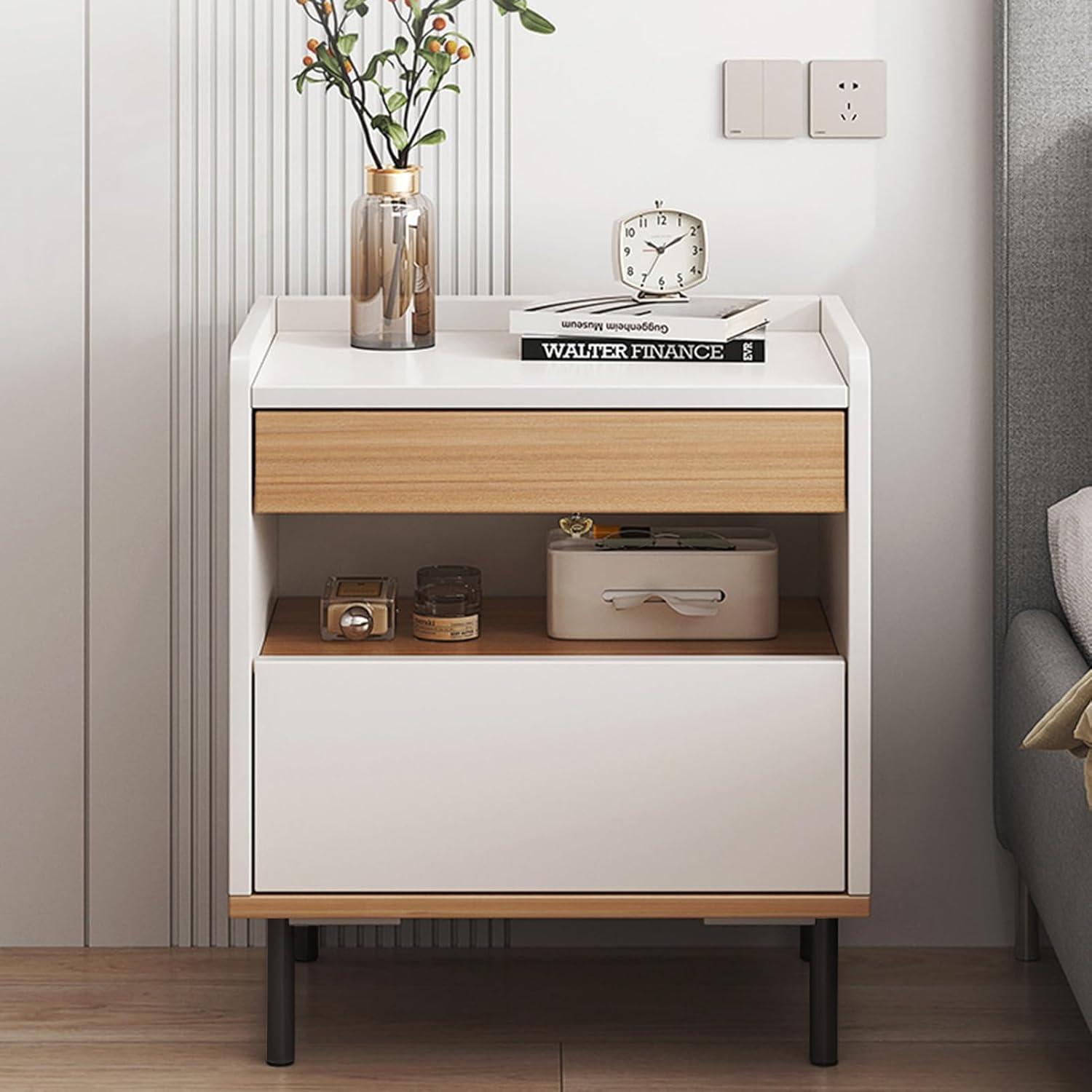 Ample Storage: The spacious drawer and open shelf make organizing bedside essentials easy and efficient. | limited Color Options: Currently only available in the white and wood splicing combination, limiting customization to personal tastes. |