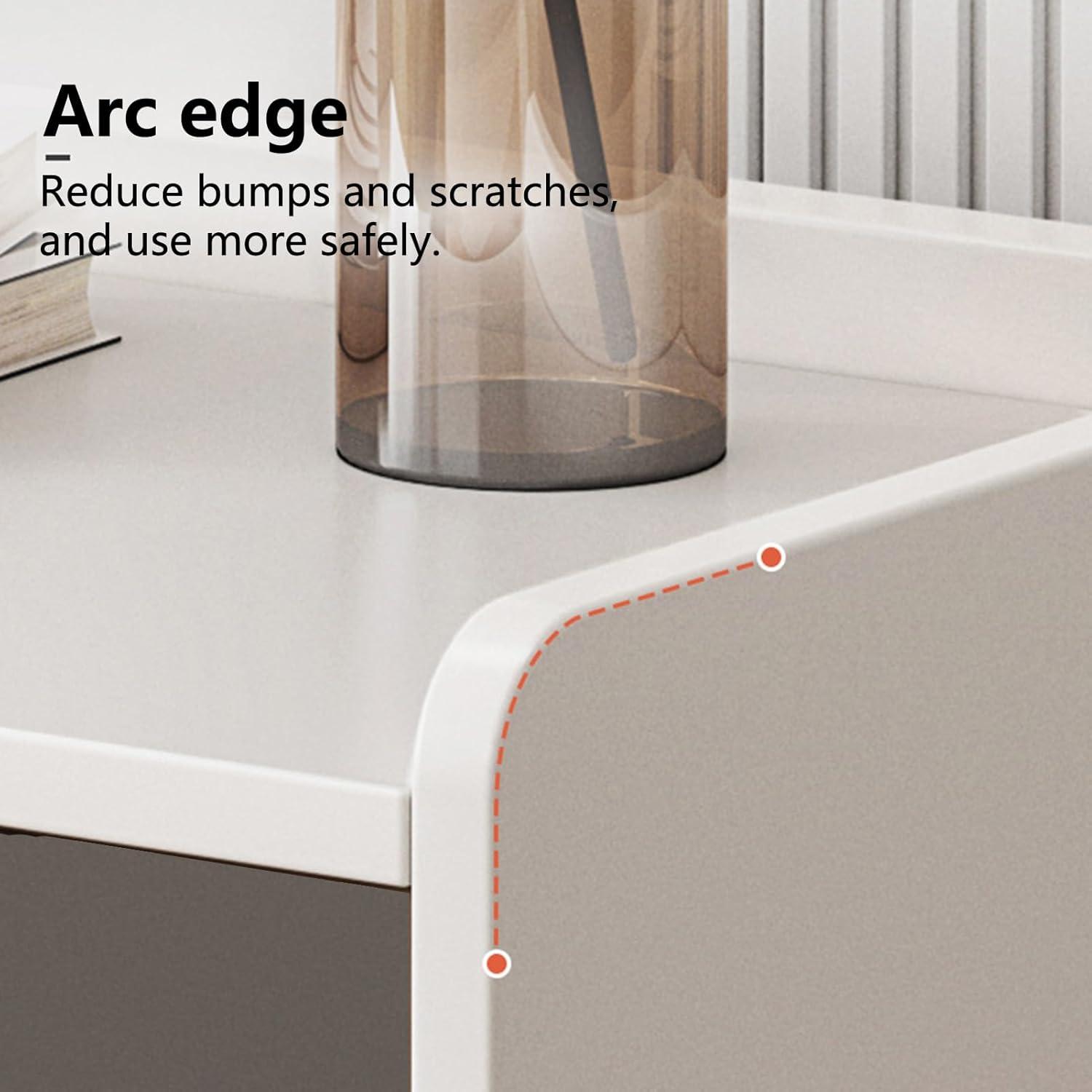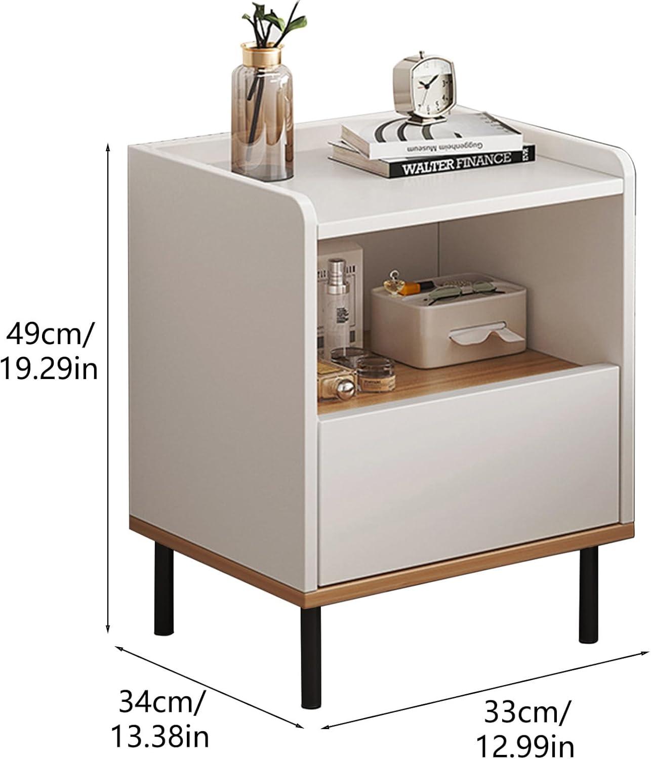 We found the design thoughtfully crafted for everyday convenience. The spacious drawer and open shelf provide ample storage options, helping to keep your essentials organized and within reach.With rounded corners and a sleek modern look blending warm white and wood tones, it complements a variety of room decors effortlessly. Its compact yet robust frame supports up to 80kg,so it can hold heavy items securely without wobbling.