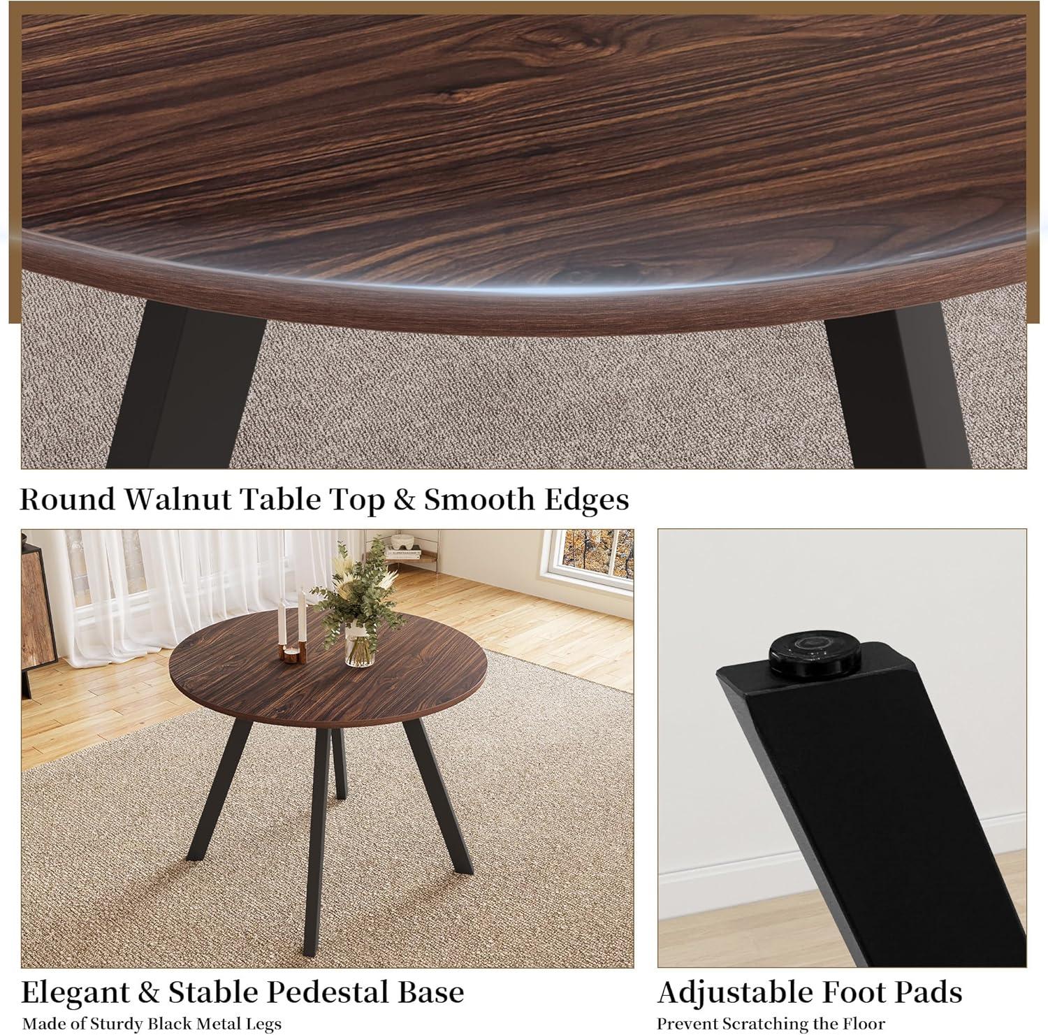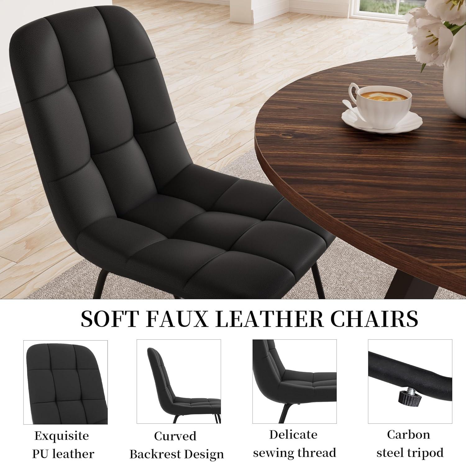 we found the combination of the dark walnut tabletop and sleek black U-shaped chairs creates a striking yet timeless silhouette that fits effortlessly into our apartment kitchen. The round table’s textured MDF surface adds subtle depth, contrasting beautifully with the smooth PU leather upholstery of the chairs. Each chair features an ergonomic curved back paired with high-elastic sponge padding, providing both comfort and style without overwhelming our limited space. The minimalist carbon steel legs finished in matt black enhance the modern look while keeping the design light and airy.