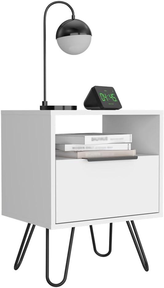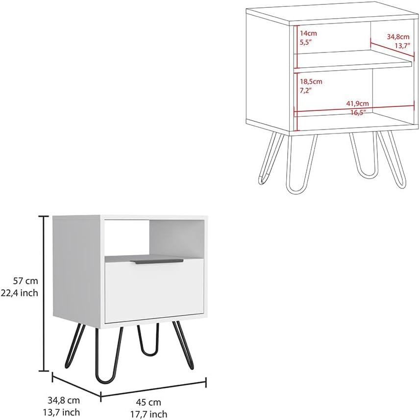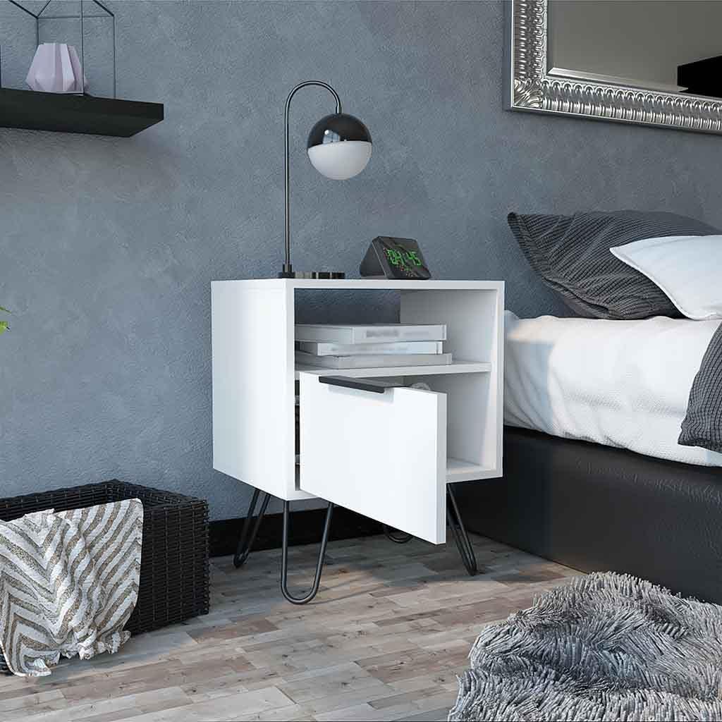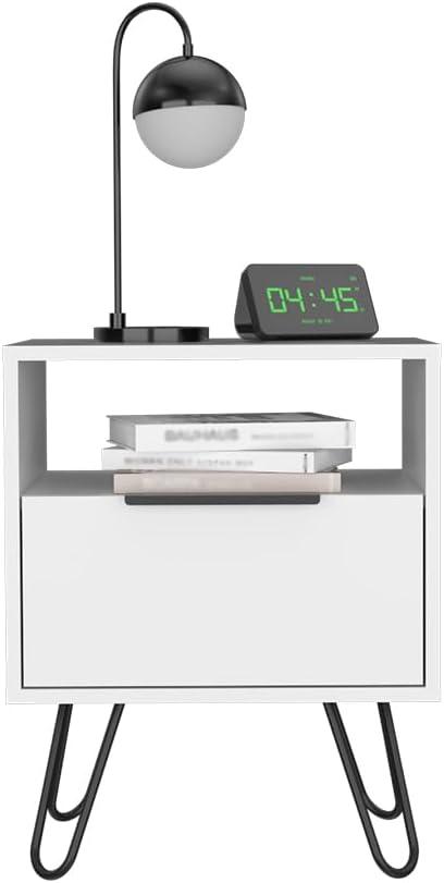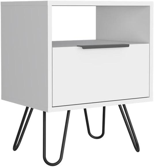 We appreciate the thoughtful combination of style and sturdiness in this piece. The nightstand features solid construction with hairpin legs crafted from durable metal, providing both stability and an elegant, modern aesthetic. The white finish complements the robust materials, resisting everyday wear while maintaining a clean, fresh appearance.Featuring a single drawer, two spacious shelves, and a cabinet with a door, the design balances functionality with structural integrity.