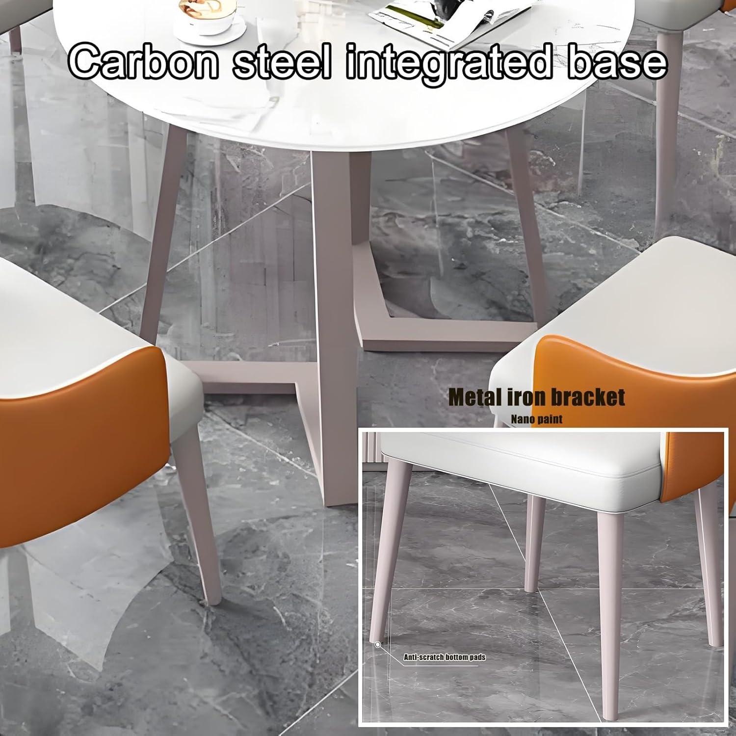 Our time with this dining set has been marked by a blend of functionality and modern simplicity. The compact design perfectly suits smaller spaces, allowing the four chairs to tuck neatly under the table when not in use, which instantly frees up room for other activities. The combination of an environmentally friendly stone tabletop and a sturdy carbon steel frame offers not only durability but also an elegant touch with its smooth, rounded edges that ensure safety without compromising style. Cleaning is a breeze due to the easy-to-maintain surfaces, and the high-quality PU leather chairs provide a pleasant seating experience that supports long conversations or quick meals alike.