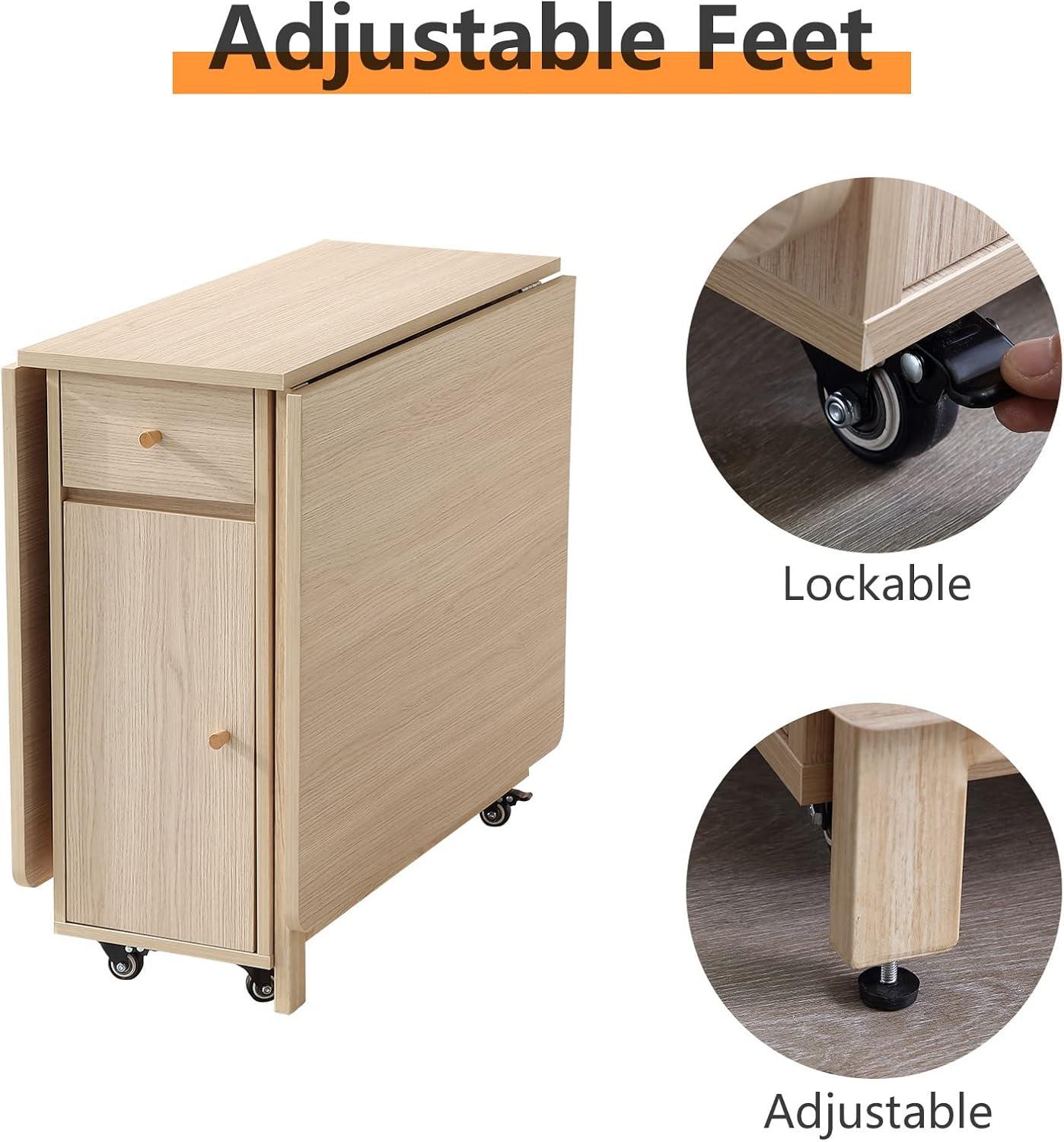 Additionally,the design integrates practical storage solutions that complement the drop leaf system beautifully. Two drawers offer handy spots for kitchenware, stationery, or snacks, while a bottom shelf cleverly stores up to four folding chairs, streamlining your space without clutter. The smooth movement is aided by lockable wheels, allowing easy repositioning while ensuring stability once locked. To keep everything secure and maintain safety, it’s essential to fully extend and lock the leaves before use and to avoid placing heavy objects when folded.