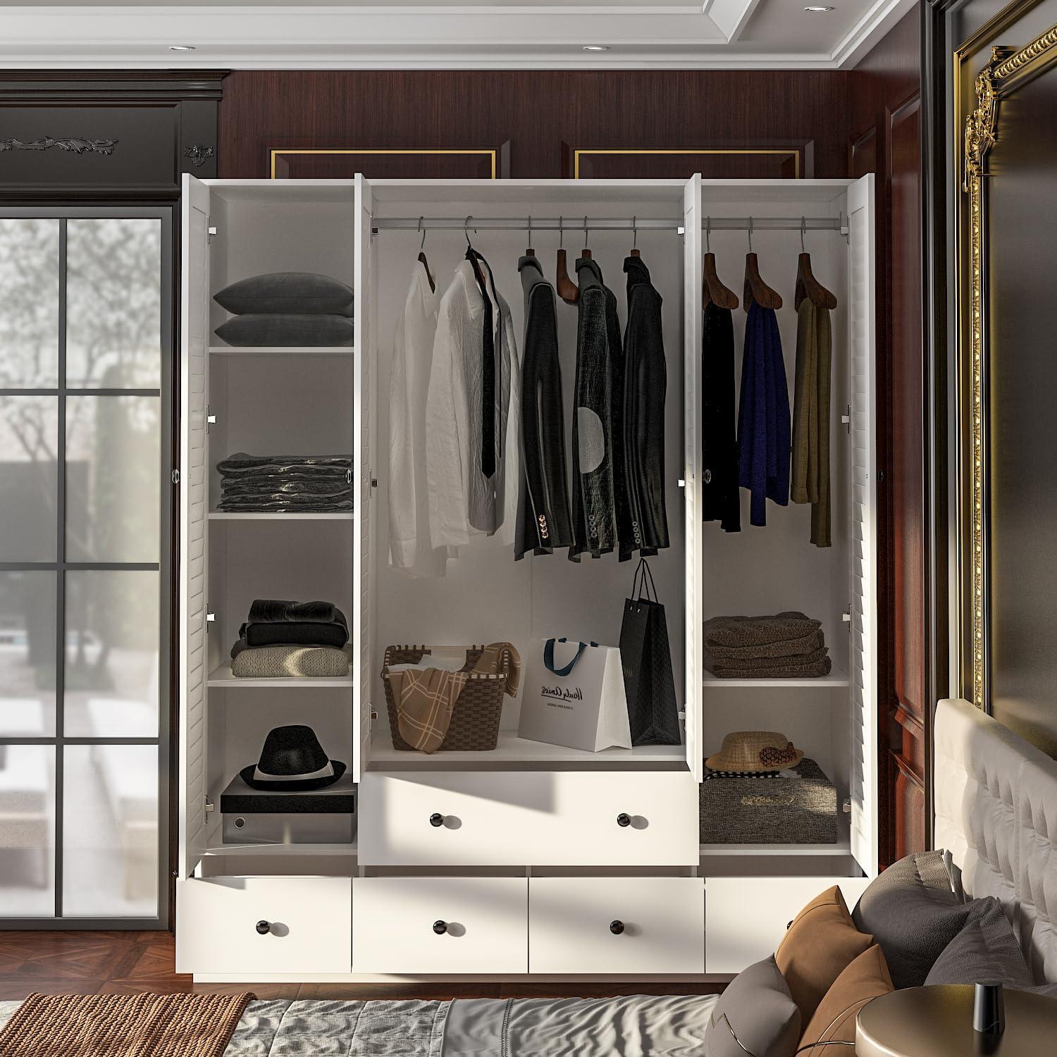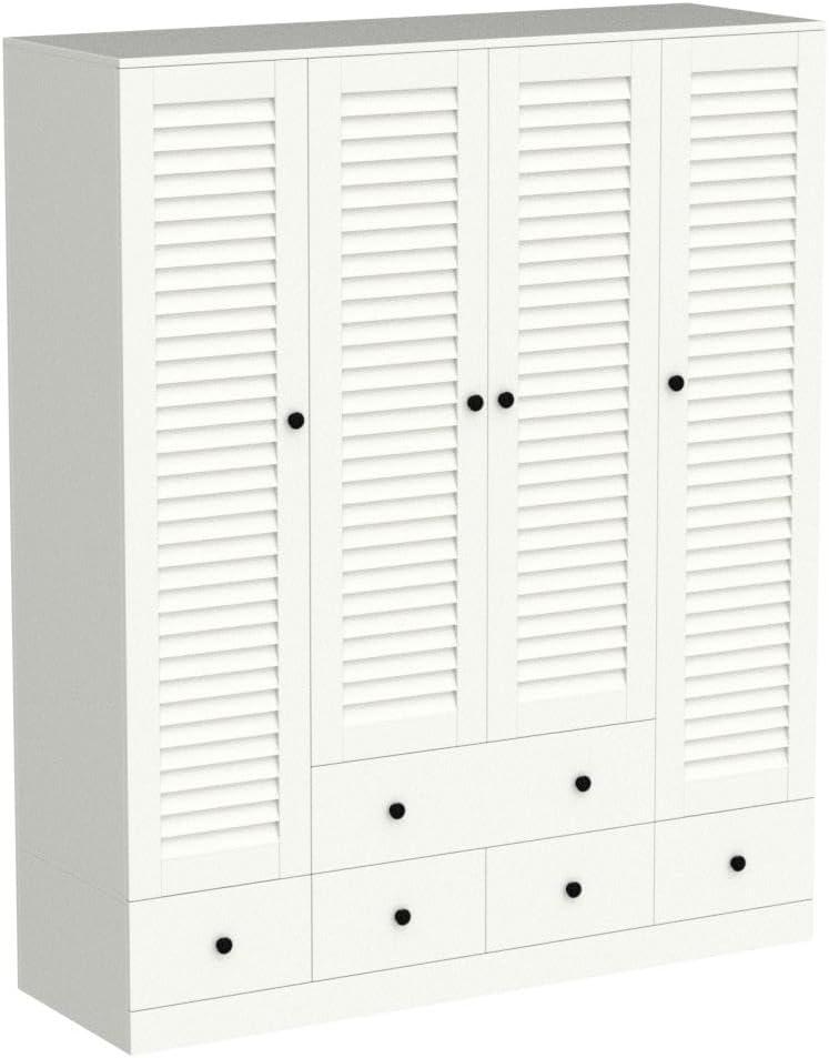 Combining functionality with an elegant presence, this wardrobe features four louvered doors that add a subtle vintage charm while promoting airflow to keep your belongings fresh. the white finish paired with sleek black handles creates a versatile style that fits seamlessly into both modern and classic room decors. inside, the layout is thoughtfully designed with a hanging rod ideal for longer garments like dresses and coats, complemented by multiple compartments of varying sizes, making it easy for us to organize everything from blankets and pillows to bags and accessories.
