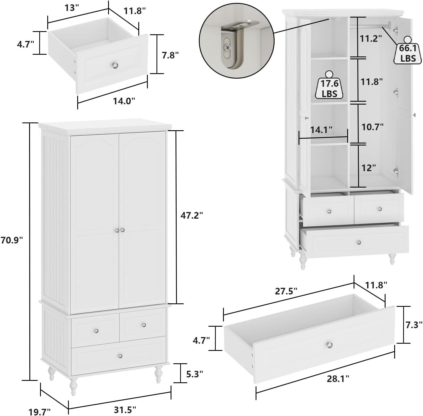 - Storage: 2 doors, 3 drawers, hanging rod, 4-tier shelves