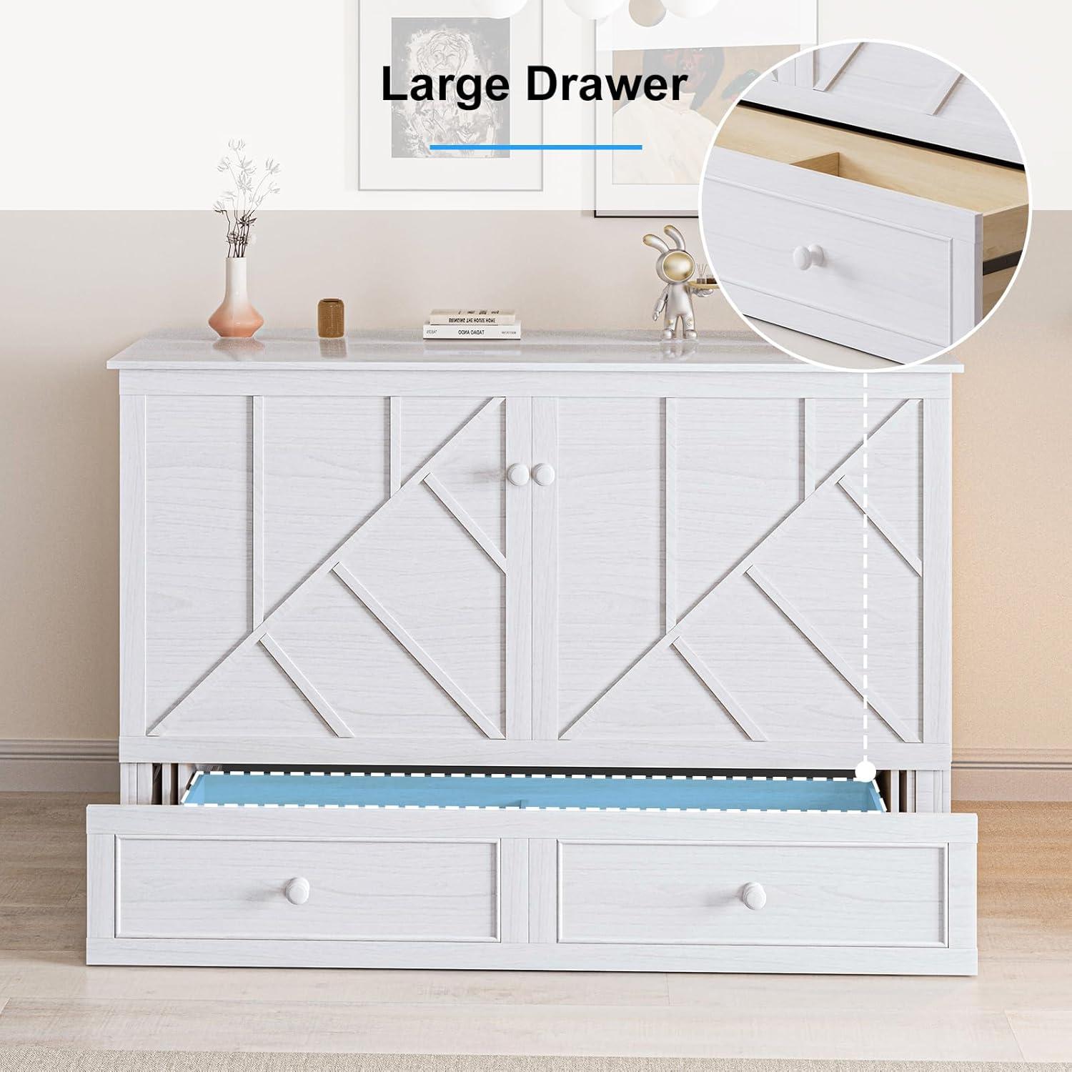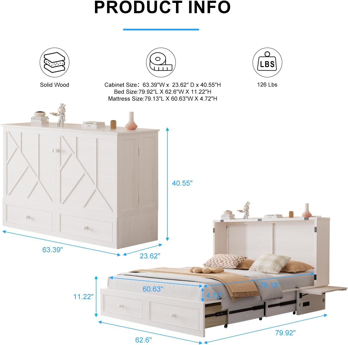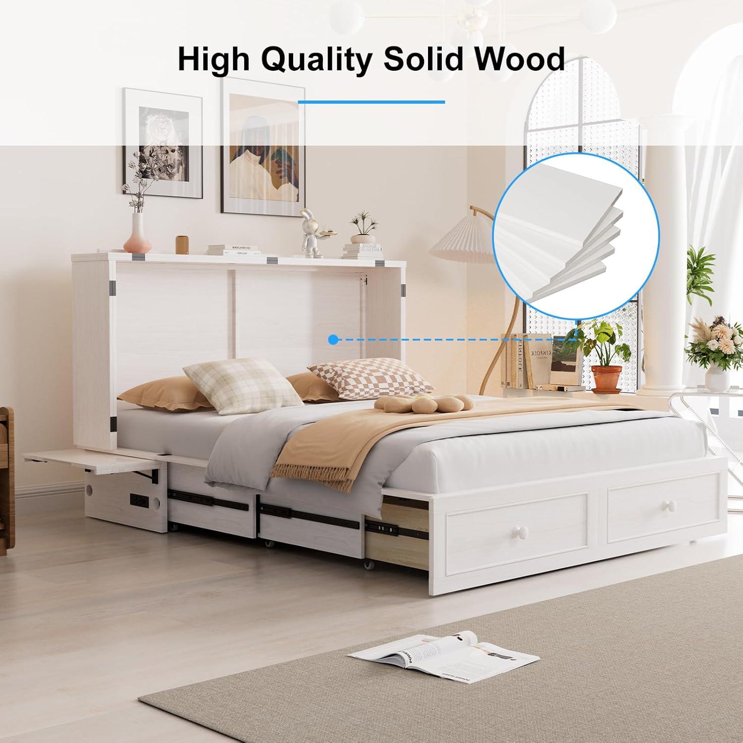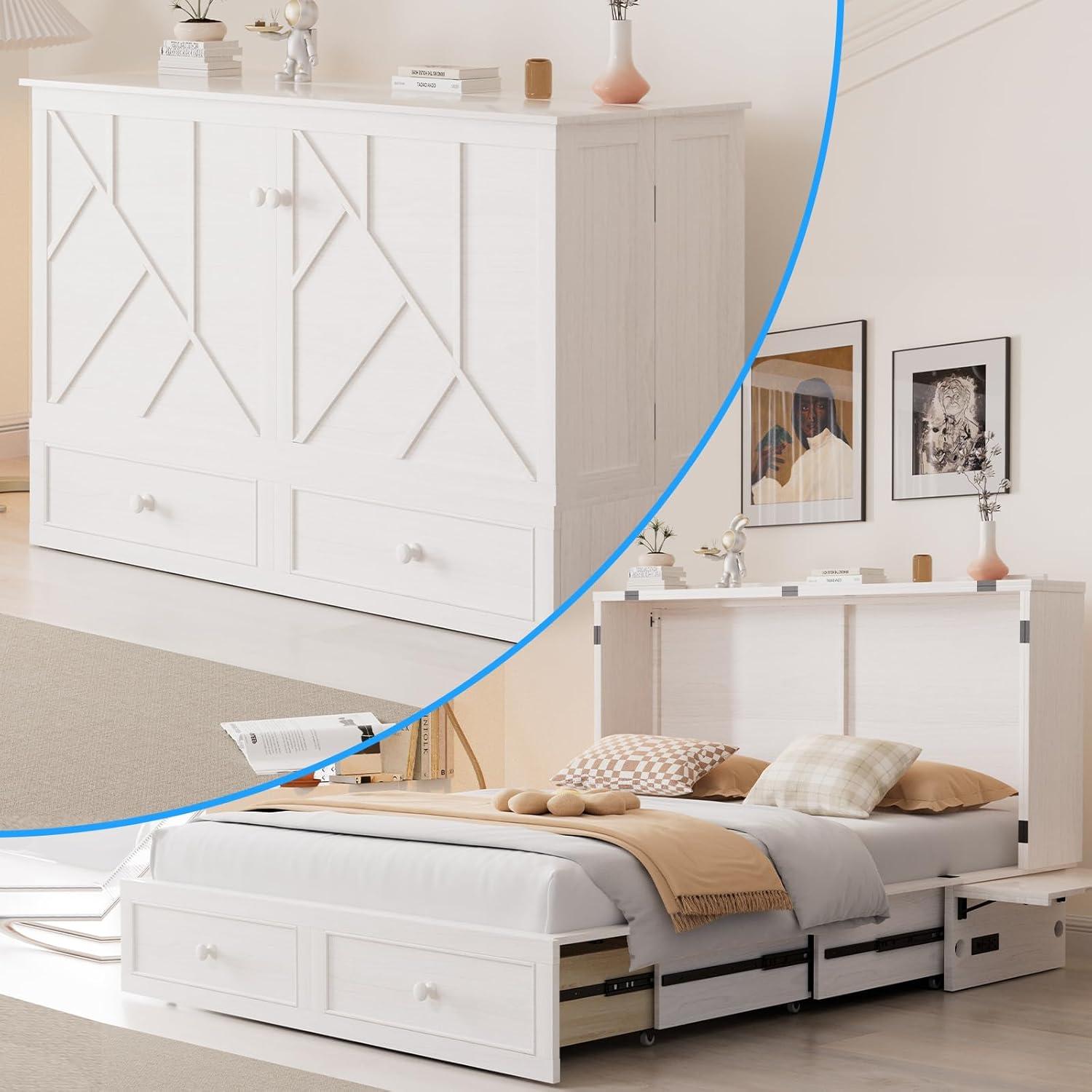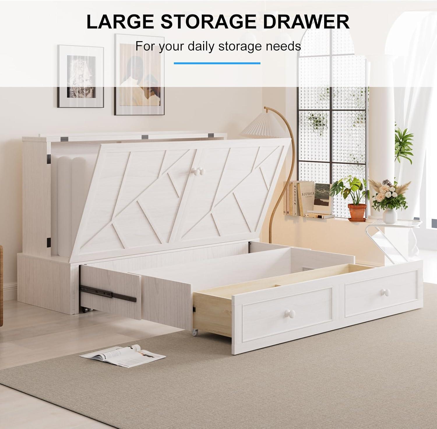 this queen-sized murphy bed impresses with its blend of comfort, functionality, and smart design. The included foldable mattress boasts a 4.7-inch thick high-elasticity foam that provides a surprisingly soft and supportive sleeping surface, perfect for a restful night regardless of your preferred sleeping position. The two spacious storage drawers add excellent value, offering well-constructed metal tracks for smooth operation and enough room to keep bedding, clothing, or even kids’ toys neatly organized. Meanwhile, the built-in charging station, equipped with 2 USB and 2 AC ports, keeps your devices conveniently powered without needing to reach for distant outlets – a thoughtful touch that enhances everyday usability.