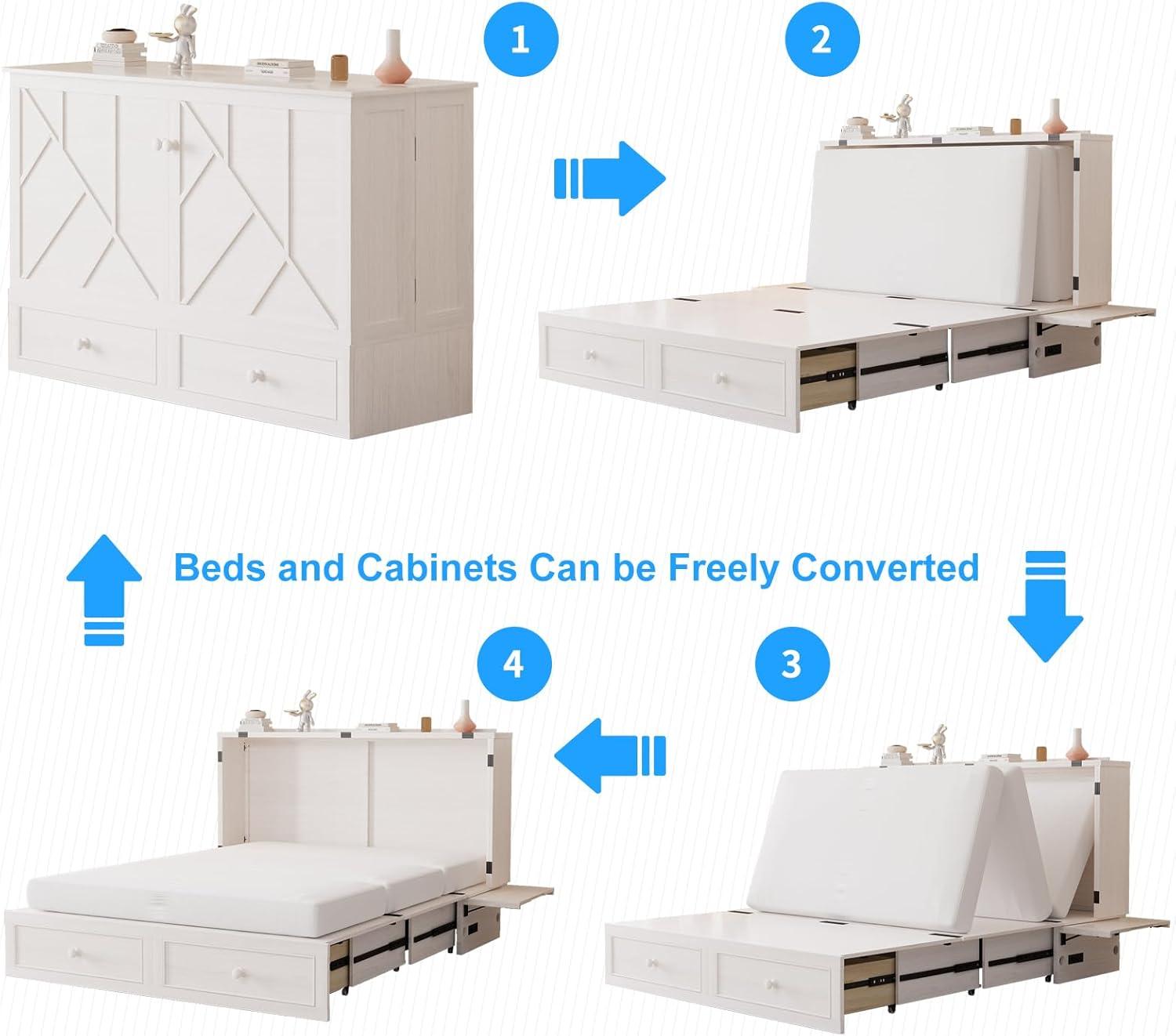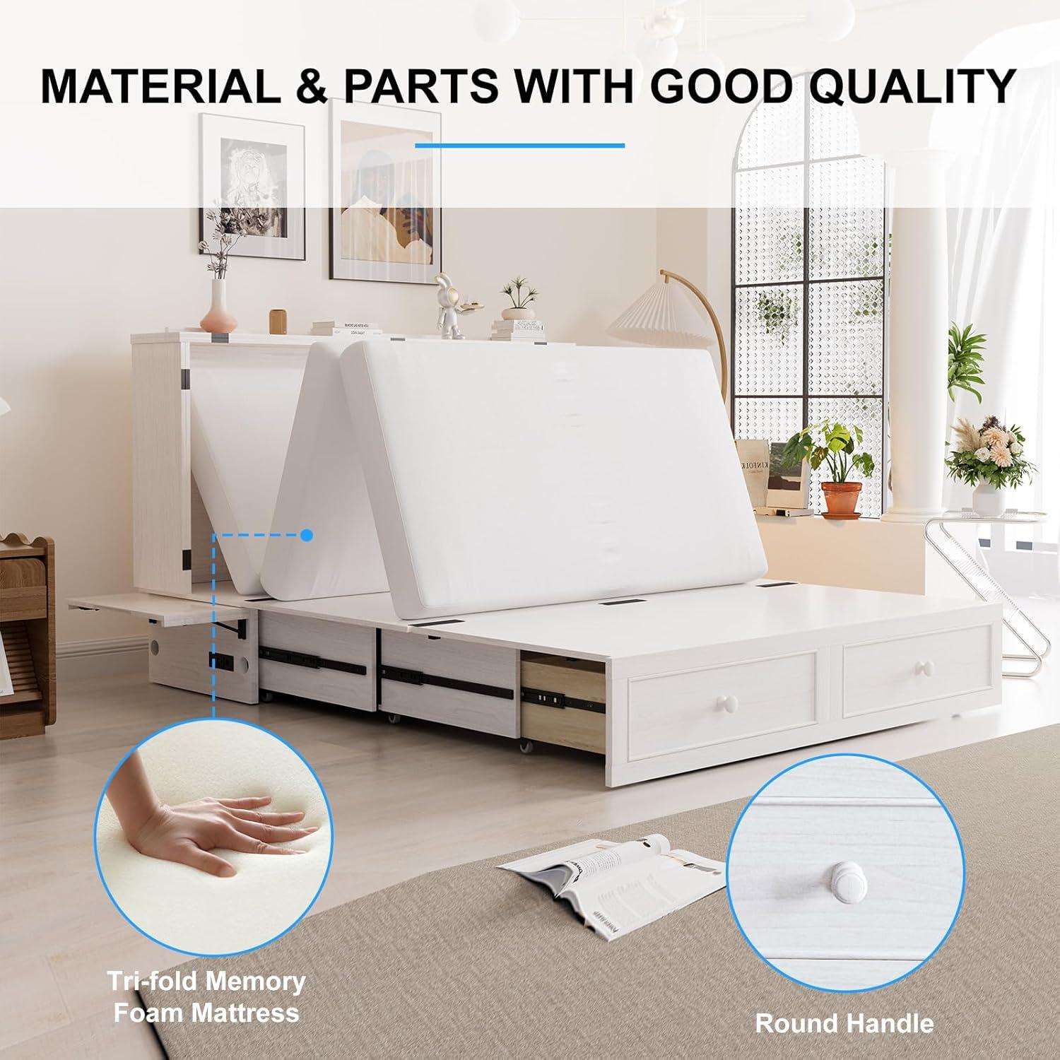 In our bedroom,this Murphy bed has become an indispensable piece of furniture that perfectly balances comfort,convenience,and smart design. The included foldable high-elasticity foam mattress is surprisingly plush at 4.7 inches thick, making it easy to transition from a relaxing daybed to a restful sleeping space without sacrificing comfort. its soft texture helps relieve pressure regardless of sleeping position, ensuring a good night’s sleep. When not in use, the bed effortlessly folds away into a sleek cabinet that creates extra room-ideal for compact living spaces or multi-purpose rooms.