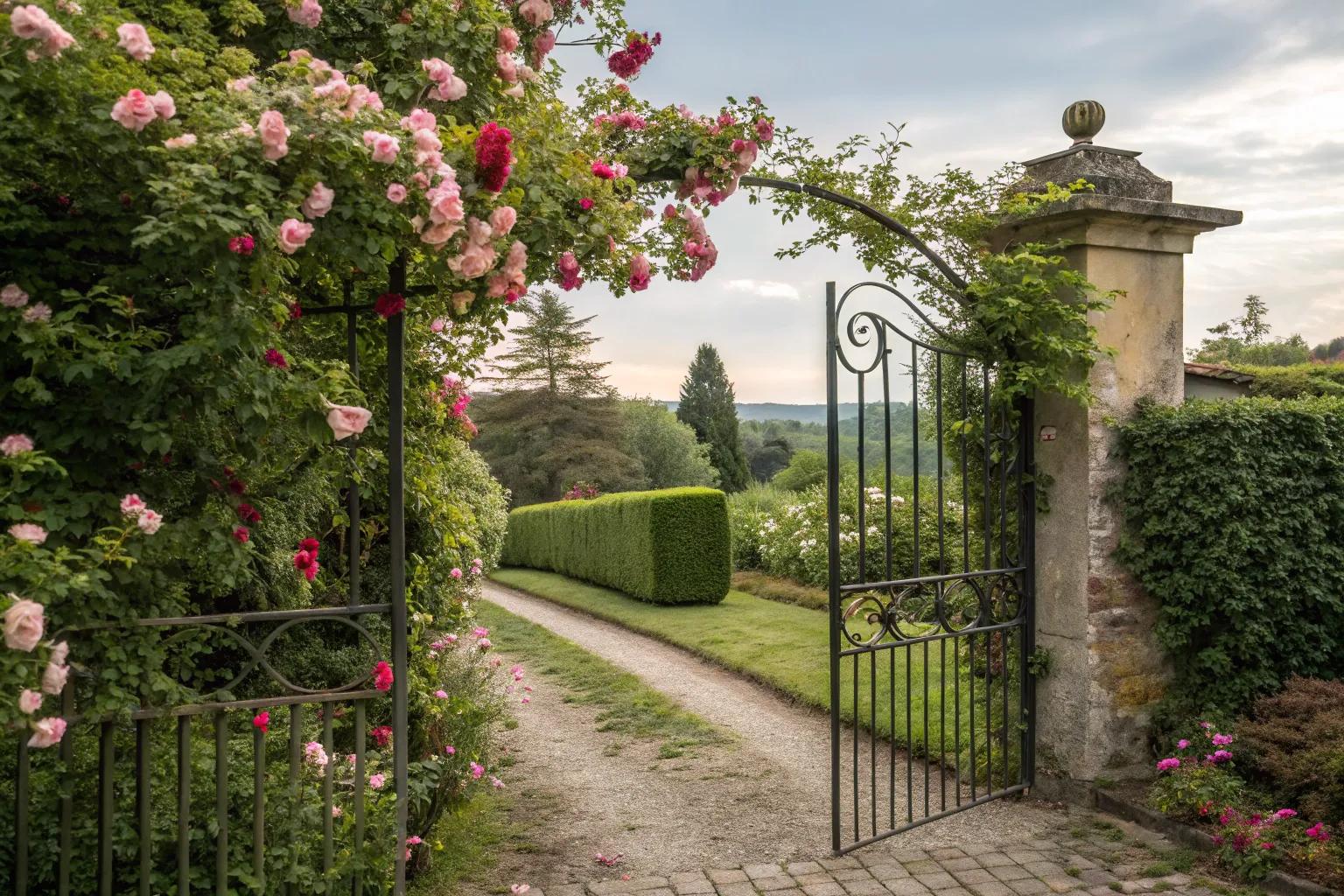 Wrought iron gates stand out with timeless elegance and intricate detail.