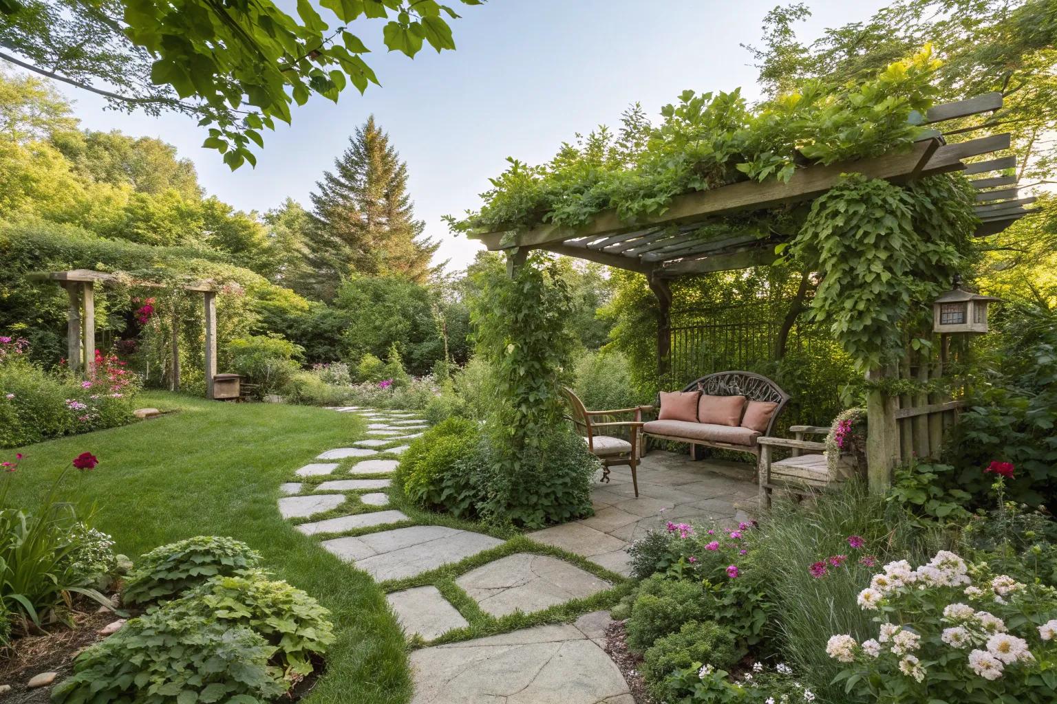 A cozy garden nook with seating under a pergola, enveloped by greenery.