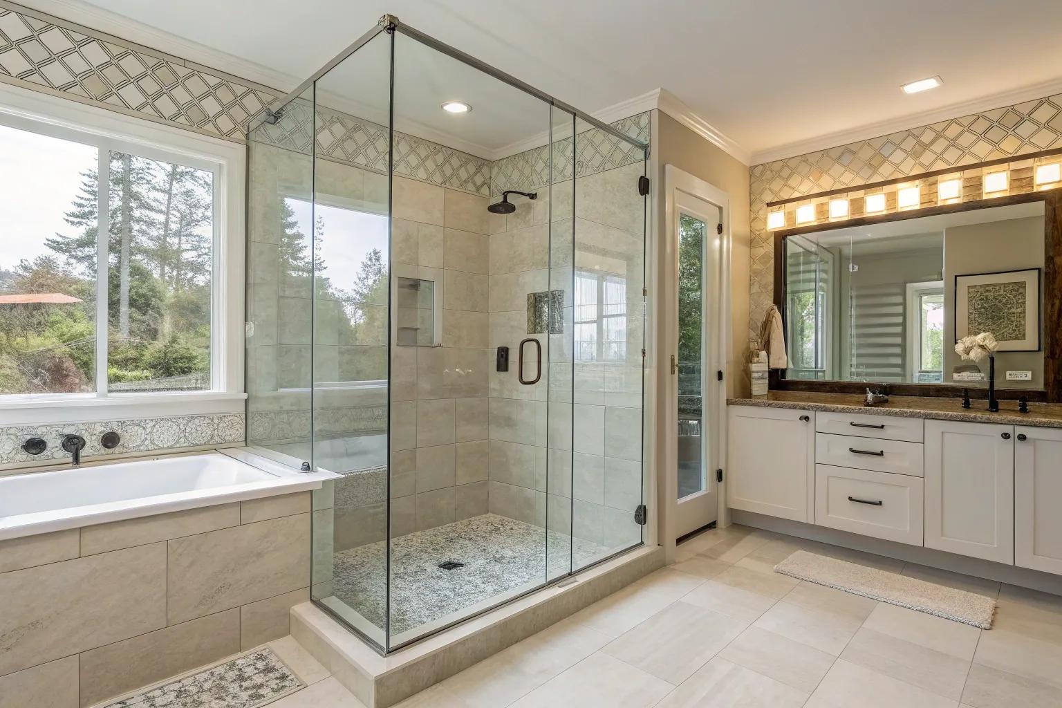 Open-plan shower featuring glass walls highlighting tile artistry.
