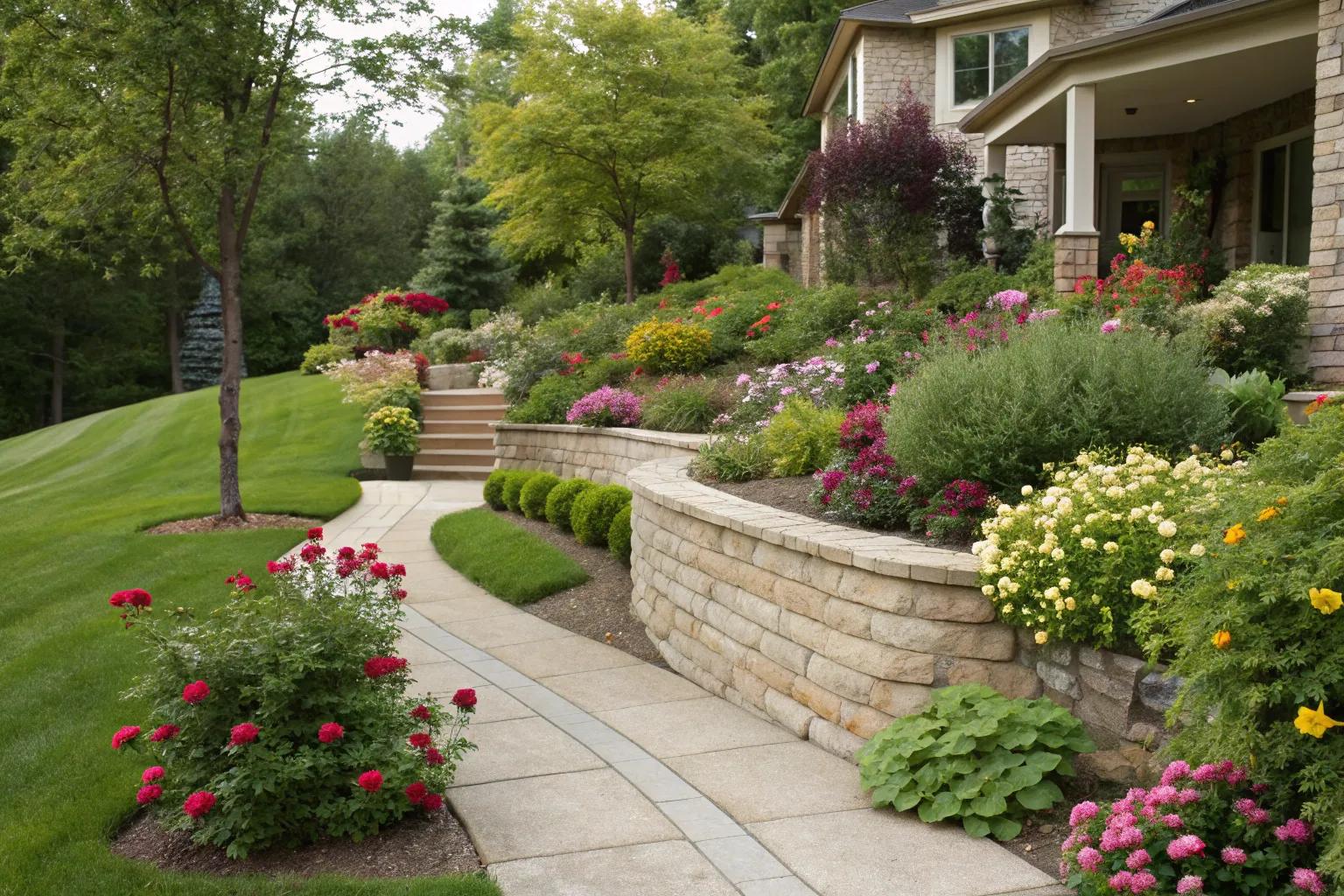Give your bland front lawn extra dimension with tiered retaining walls that create multiple layers perfect for diverse plantings. This layered design not only beautifies but enhances functional space for gardeners.
