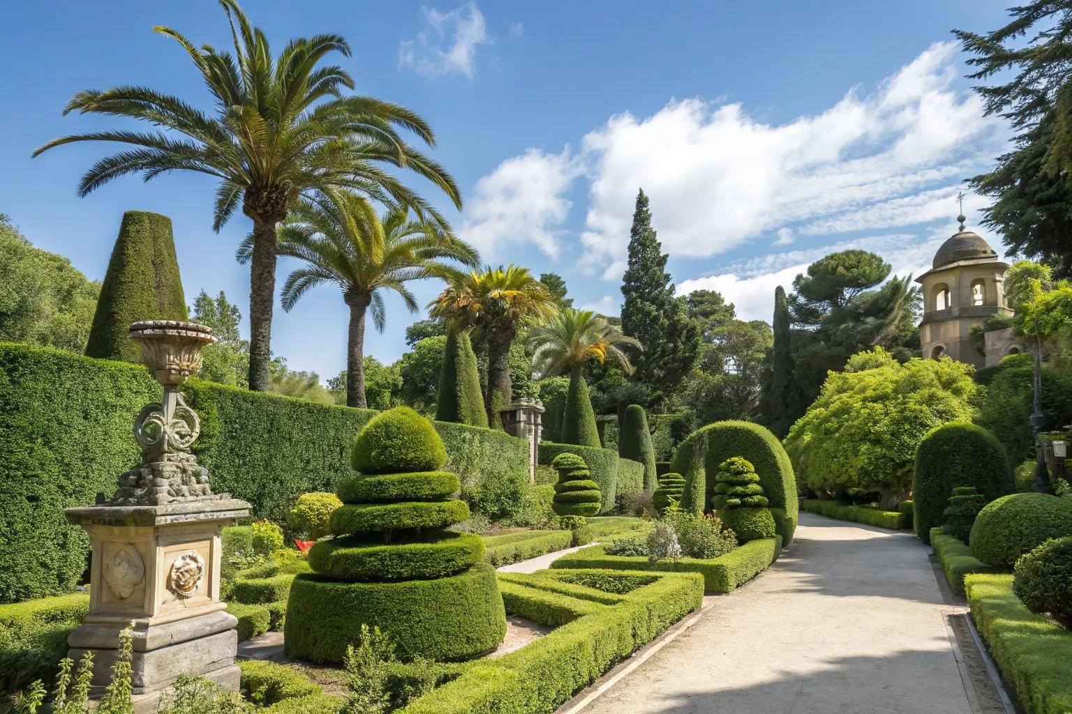 Symmetrical topiary designs add a classic touch to gardens.