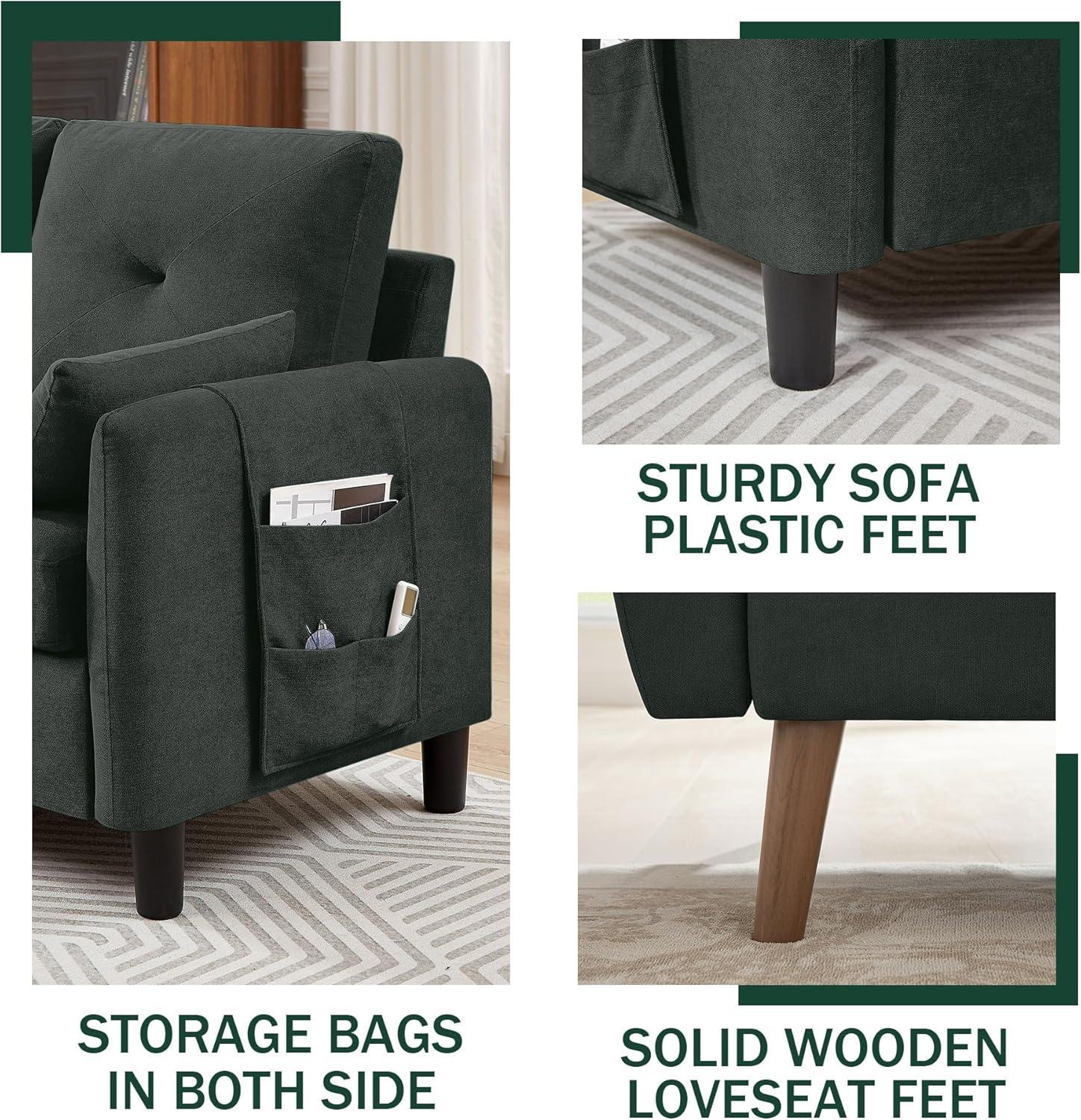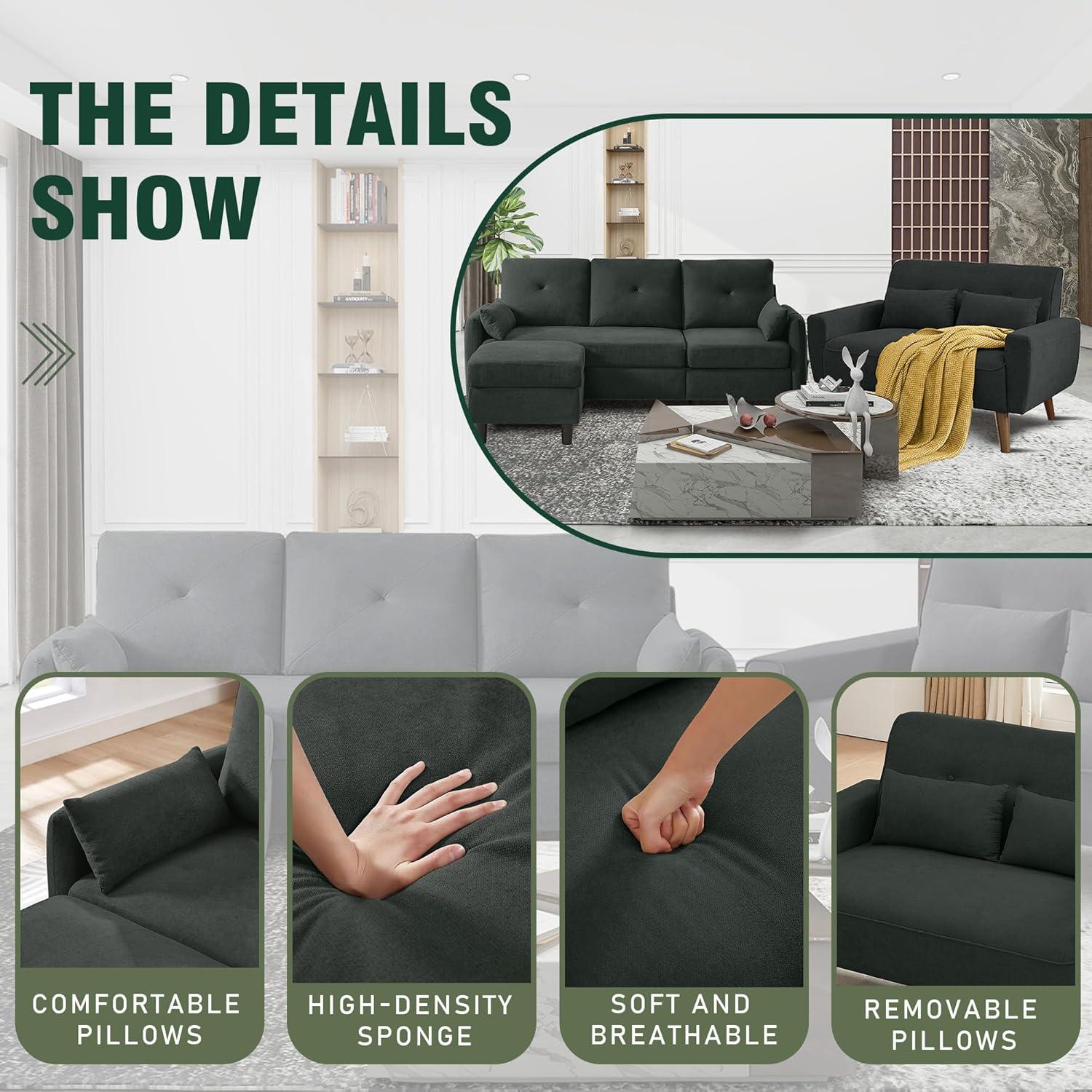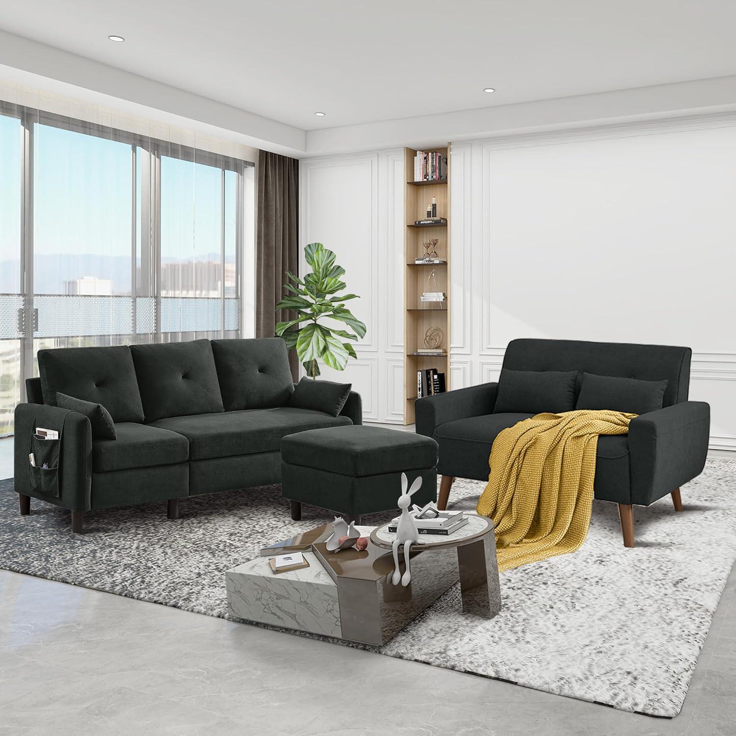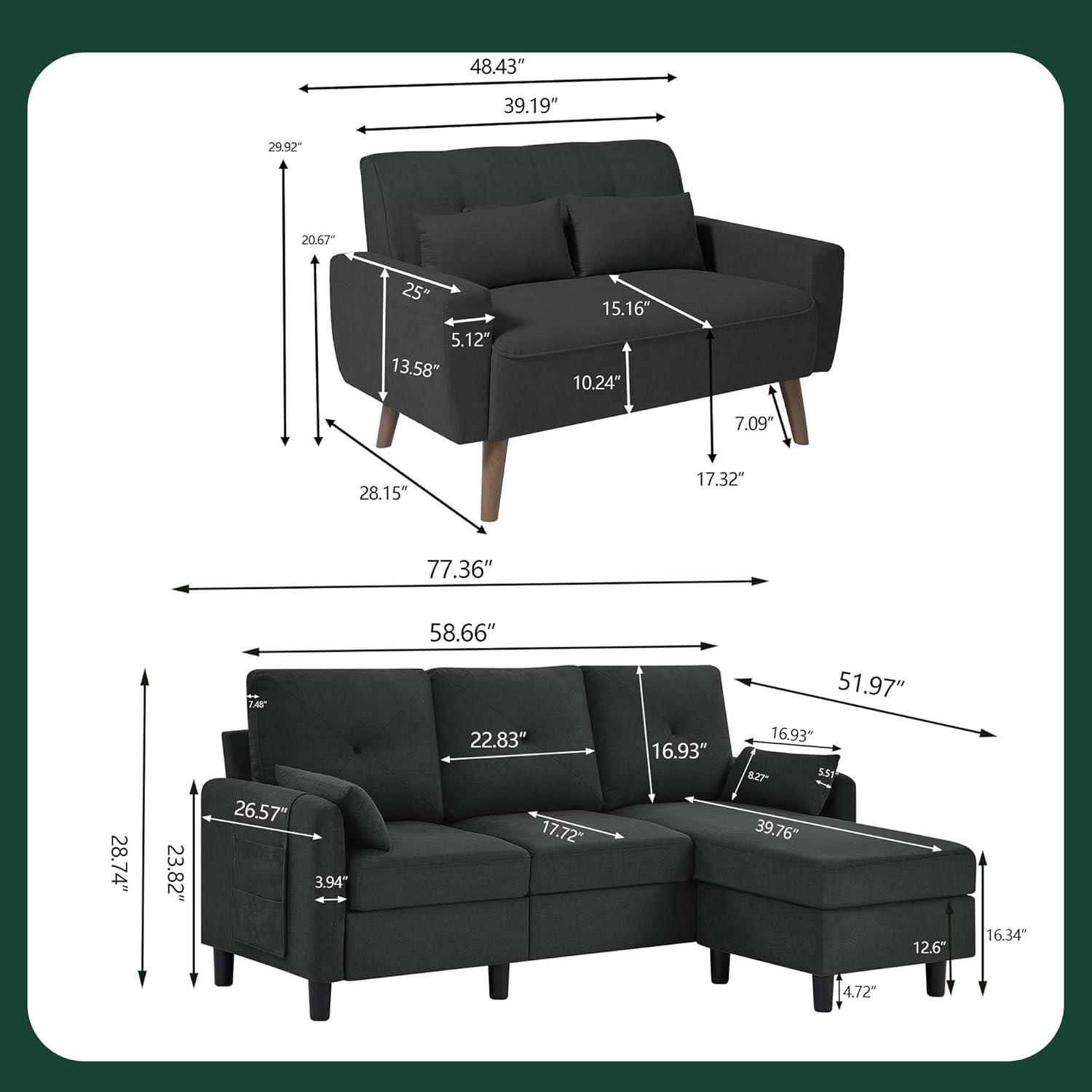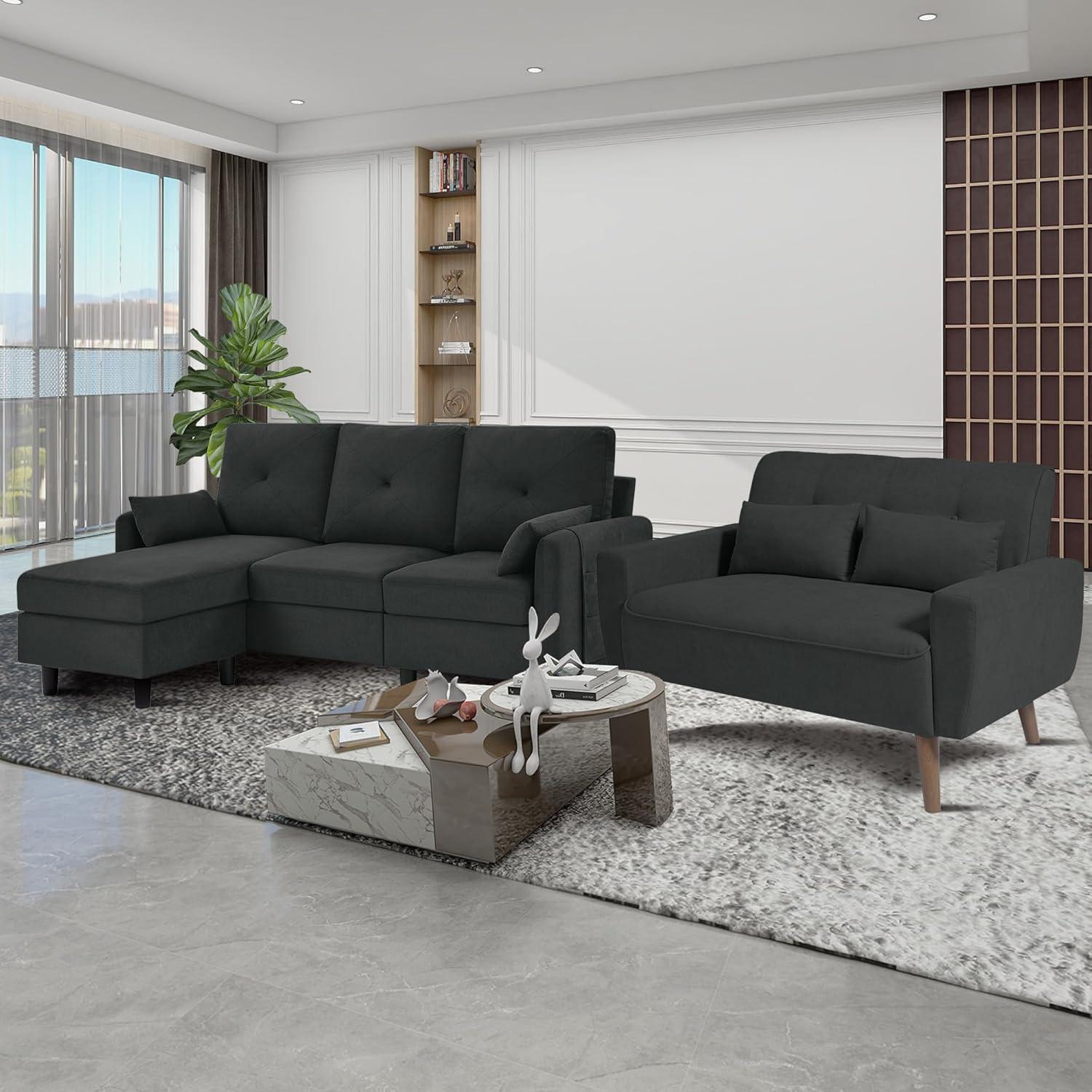 Living with the Convertible Sectional Sofa Set, 77″ Small L Shaped 3 Seat Couch with Ottoman and 48″ Loveseat, Modern Sofa couches for Living Room, Black, you notice it slowly folding into the room’s quiet patterns rather than announcing itself. Over time, in daily routines, its footprint shapes small uses of space — the ottoman works as an extra perch or a low table, the loveseat becomes a habitual reading spot, walkways relax. The cushions take on the outlines of who sits there, the surface gathers faint scuffs and a soft patina from everyday life, and comfort shifts toward familiar give as the room is used.It settles into regular household rhythms and simply stays.