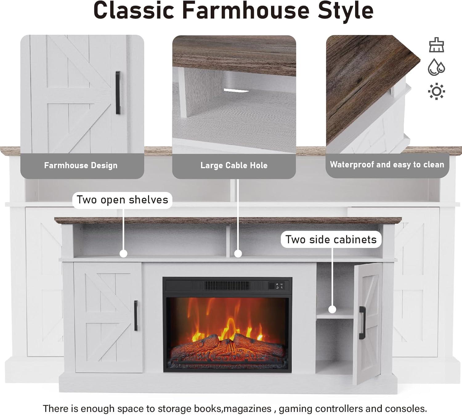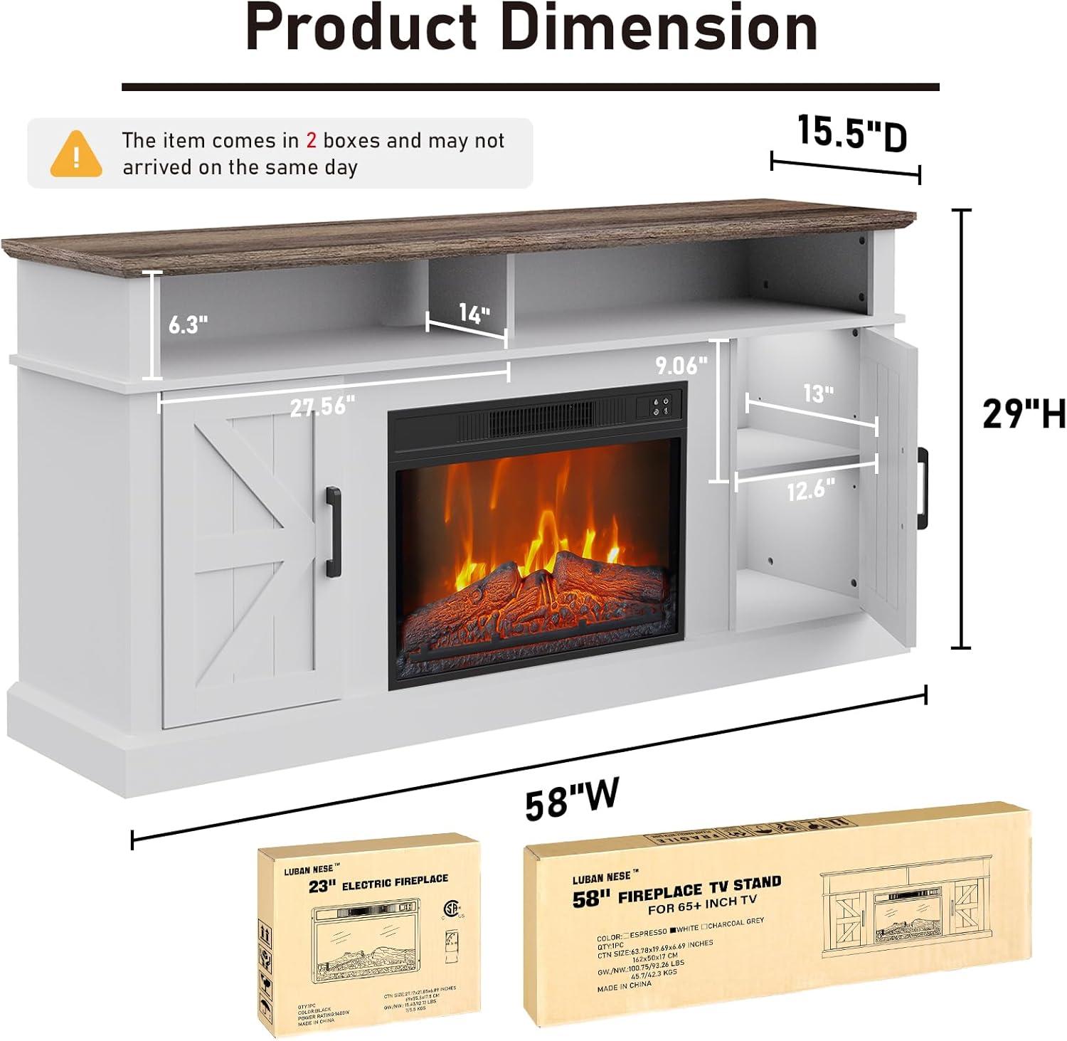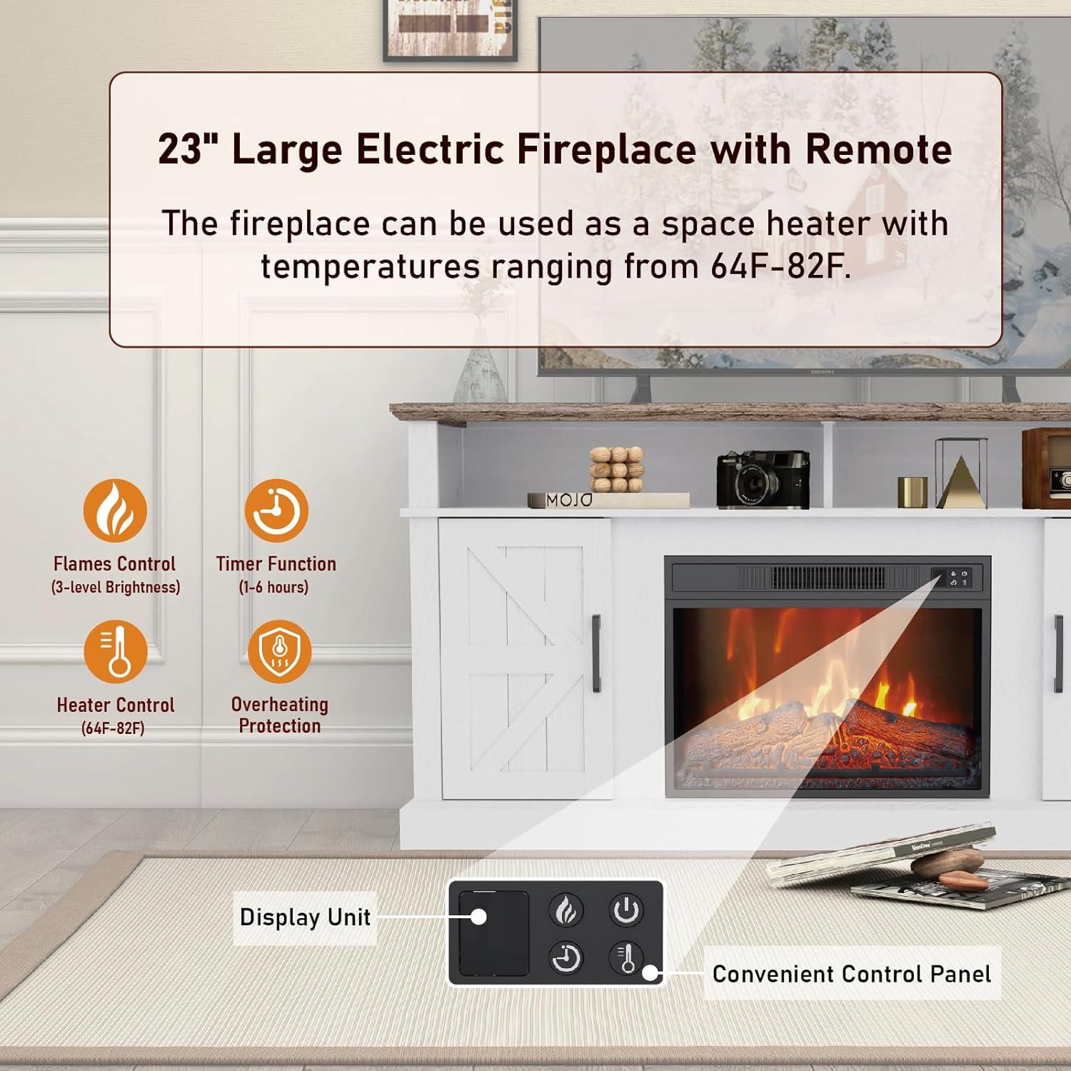 Light skims the painted surface and brings out knots in the wood—right away you notice the visual weight of the Luban Nese Fireplace TV Stand, a white farmhouse-style console with a built-in electric fire.Up close, the solid-wood top feels cool and slightly textured under your palm, while the barn doors slide on sturdy hardware with a faint, workmanlike thump. Open shelves sit low and horizontal, giving the piece a grounded silhouette, and the 23″ flame insert throws a soft amber flicker that warms the painted finish. In an everyday living room it reads like a lived-in fixture—you feel its scale and material presence before you even tune anything on.