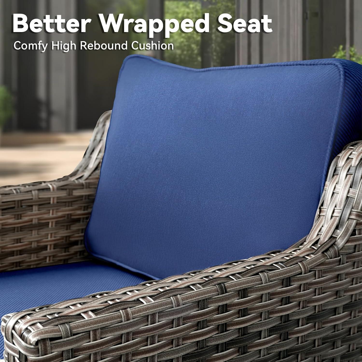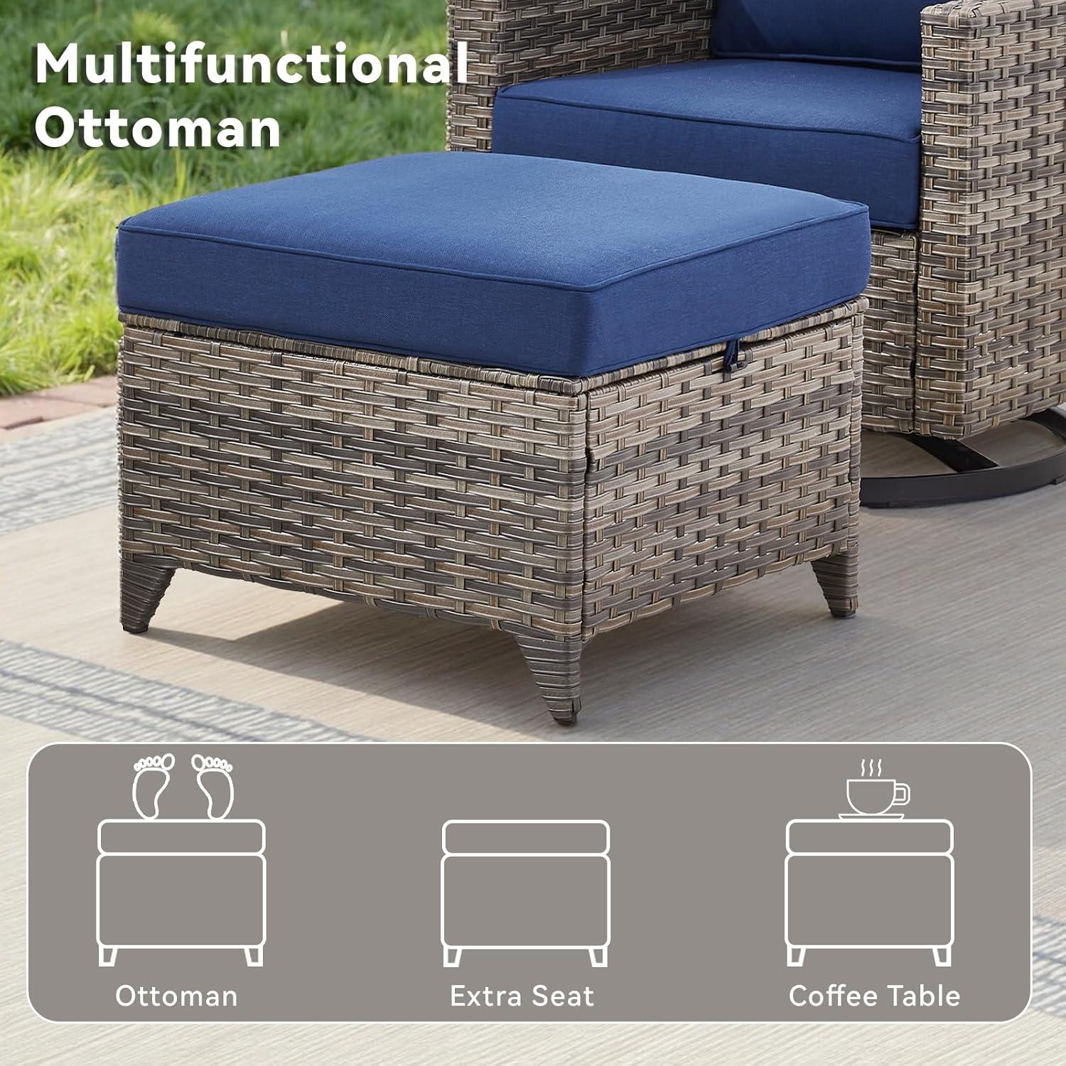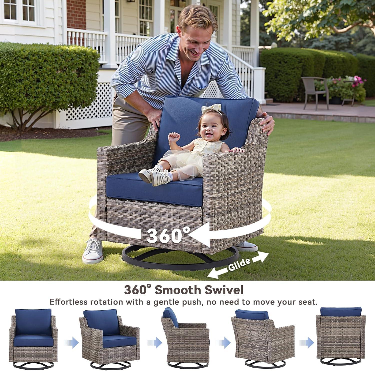 When the set becomes part of your backyard or sunroom routine, it settles into small, everyday rhythms. you’ll find yourself smoothing cushions after a long sit,nudging ottomans into place as footrests or extra seats,and turning the swivel chairs back and forth without thinking. Glass side tables collect drip rings and crumbs faster than you expect, and the wicker catches dust, pollen and the odd leaf when a window or door is open. Cushions compress a little through an afternoon of lounging and seams or covers shift when you hop up; you tend to zip covers back into place or tuck a corner under while passing by. In the sunroom the set spends more time stationary and a sunny afternoon can make fabrics feel warmer to the touch, while in the backyard you’ll notice more frequent dusting and a couple of umbrella-timed moves when storms roll in.
