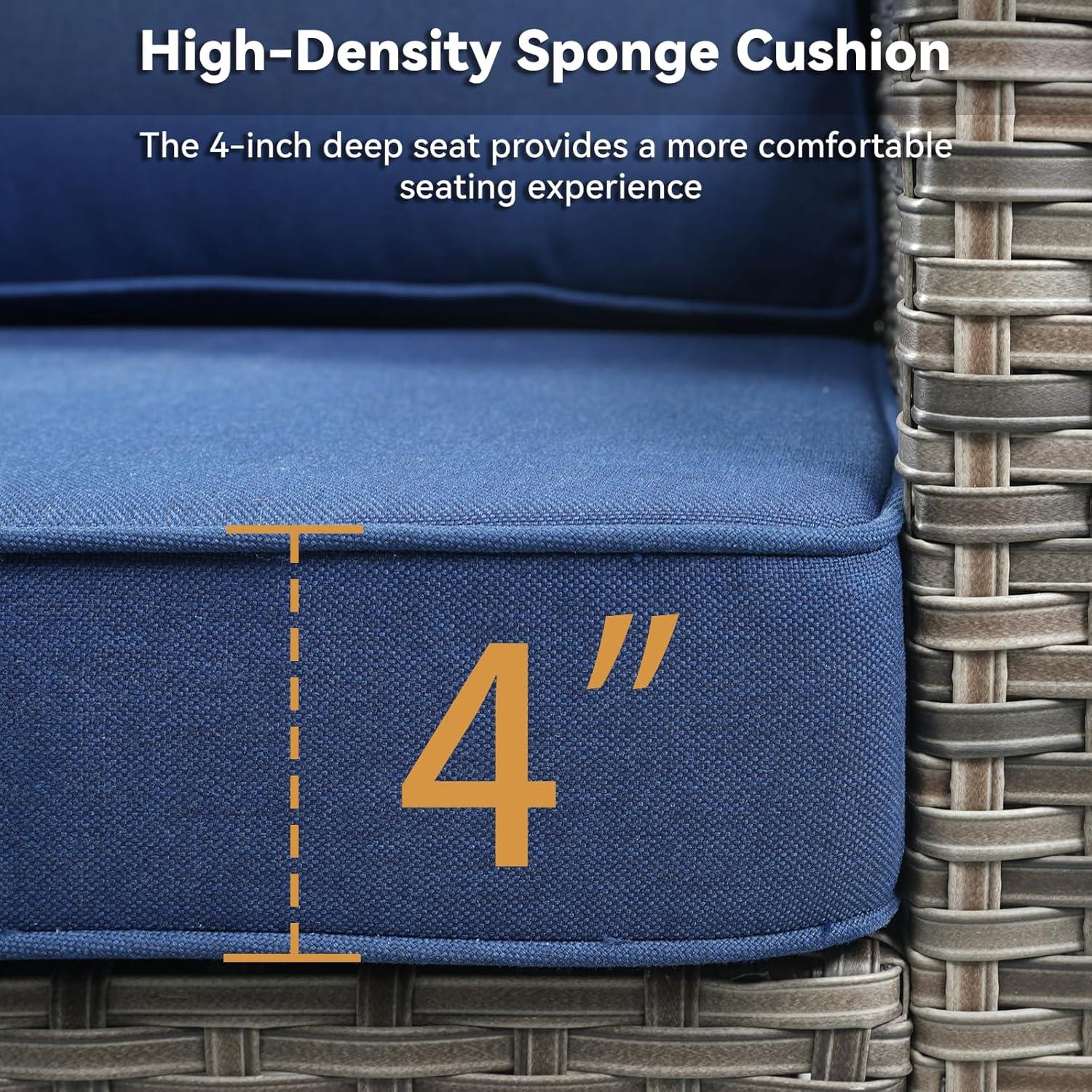 When you settle into the sofa or swivel chair the first thing you notice is how the cushion gives beneath you: the 4‑inch padding compresses gradually, so your weight shifts back toward the wicker high back rather than resting purely on the seat base. That sinking is subtle — you will smooth the cover or shift a seam once or twice as the foam re‑beds — and the resulting seat depth feels roomy enough to tuck a knee up or extend a leg toward an ottoman without the back losing contact with your lumbar area. The swivel action and the rounded base mean the seating footprint subtly changes as you rotate; a chair that looks compact from the front can project a little further when the glide is engaged and someone leans back.