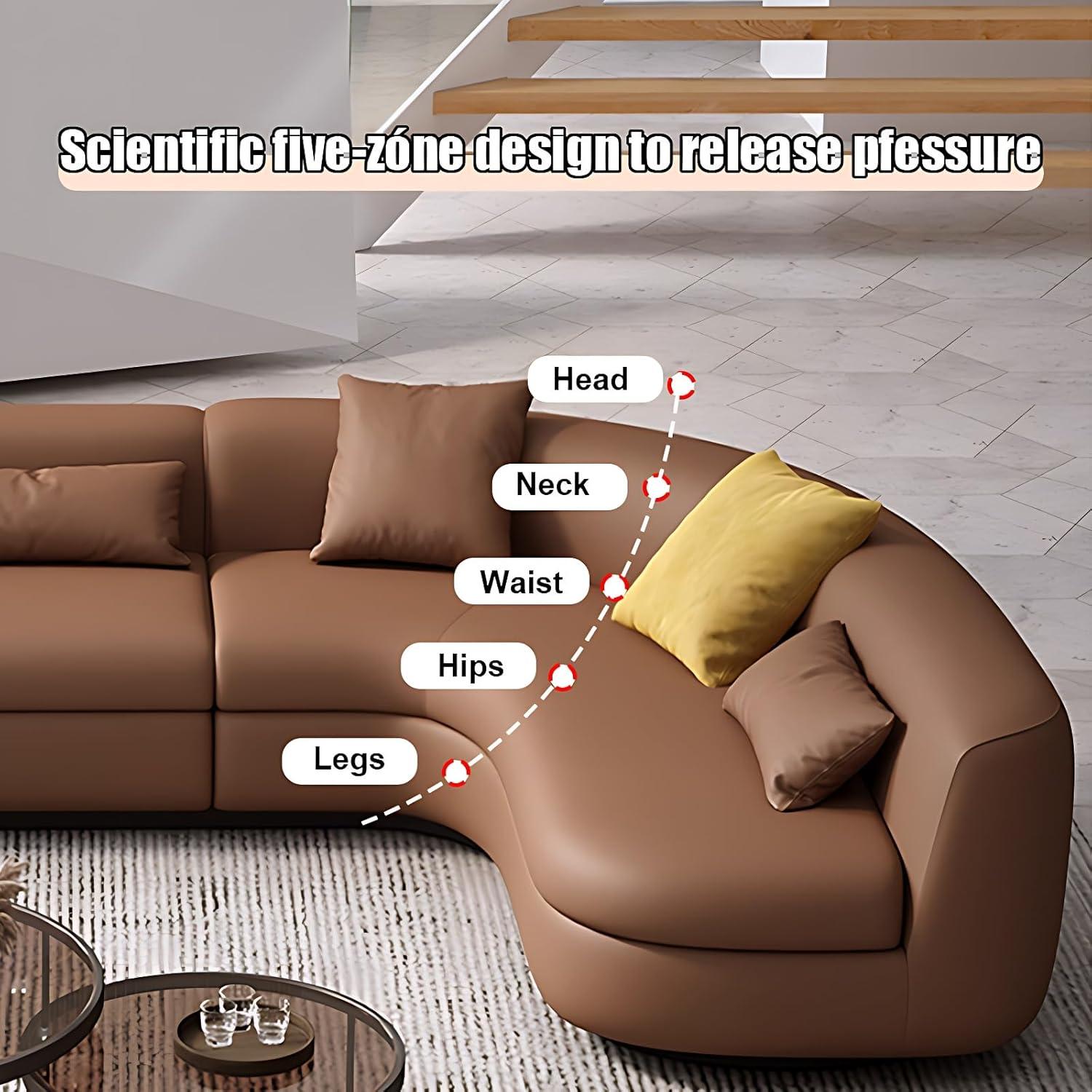 You run a palm along the curved back and the brown leather feels cool and slightly textured beneath your hand — the LyckTre Curved Sectional, as it arrived, reads like a quiet centerpiece in the room. Its low, sweeping silhouette nudges the eye around the space; three wide seats and a matching chair give the arrangement a settled visual weight. Under the lamp the leather catches a soft sheen, and the cushions push back with a springy firmness that changes how you drop into the sofa. Even before you sit,the set’s grounded presence is clear from the way it anchors the floor and frames the coffee table.