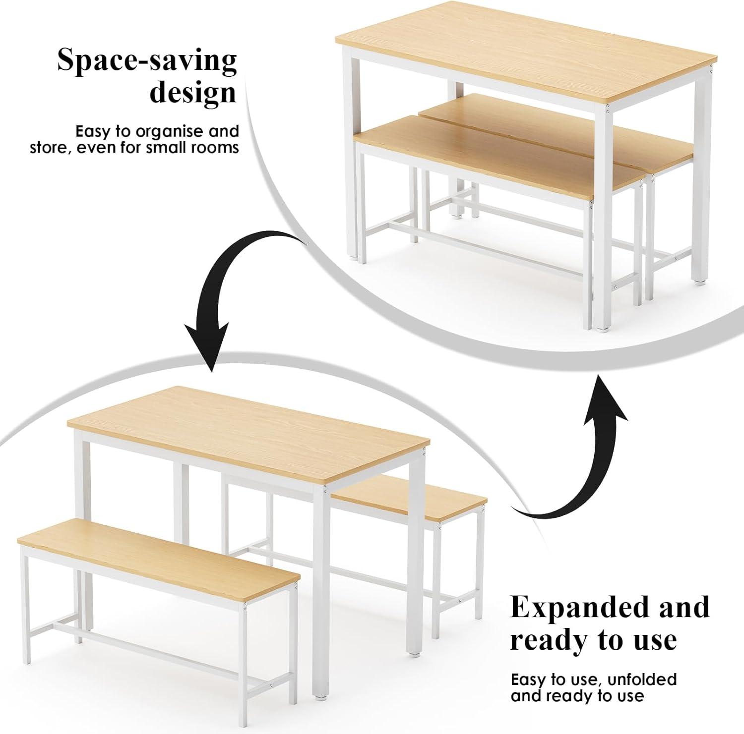 This compact dining set offers a clever, stylish solution ideally suited for apartments, breakfast nooks, or any small living area where space is at a premium. Featuring a rectangular tabletop paired with two benches that conveniently slide under the table, this design maximizes floor space without sacrificing comfort or utility.The set comfortably seats four people, making it perfect for intimate family dinners, casual breakfasts, or amiable gatherings.