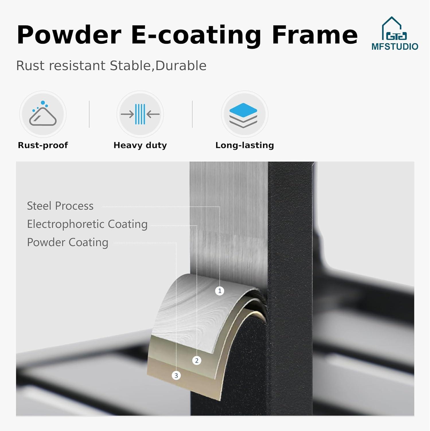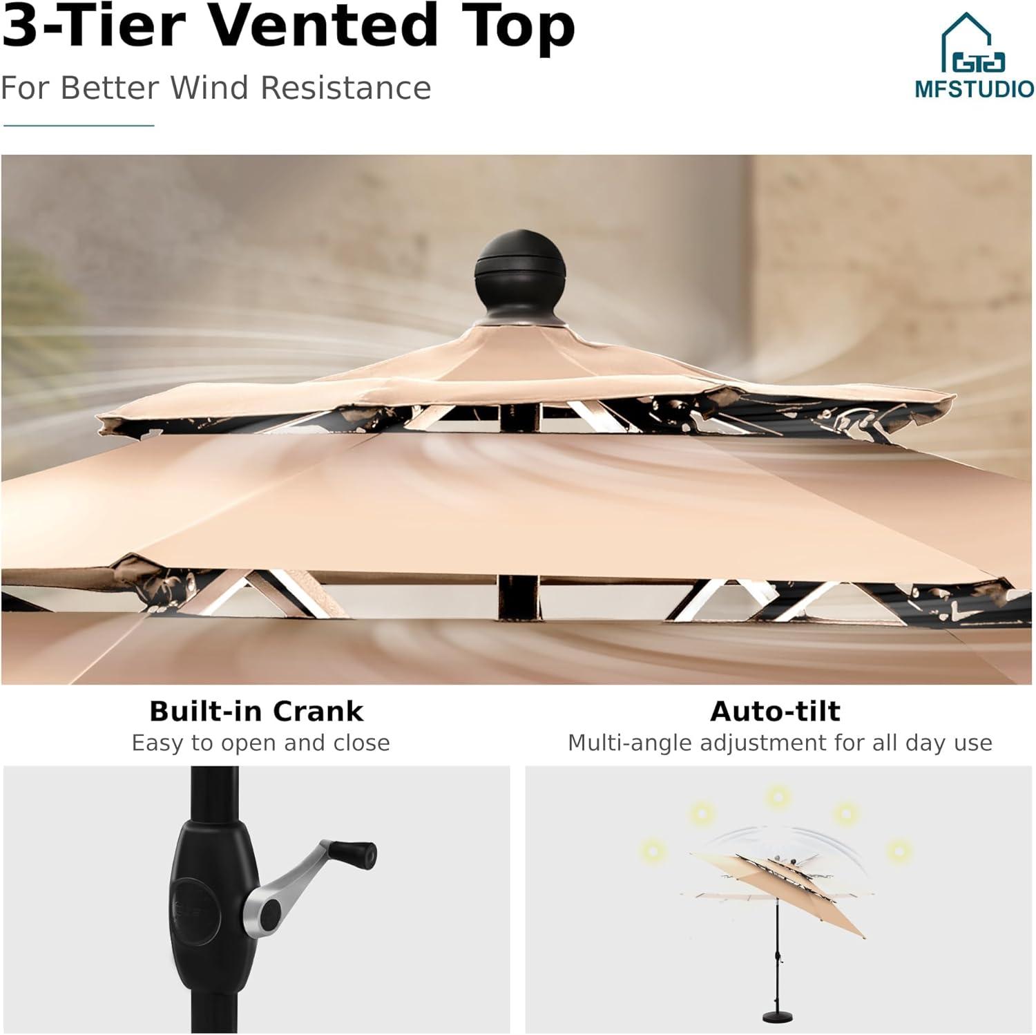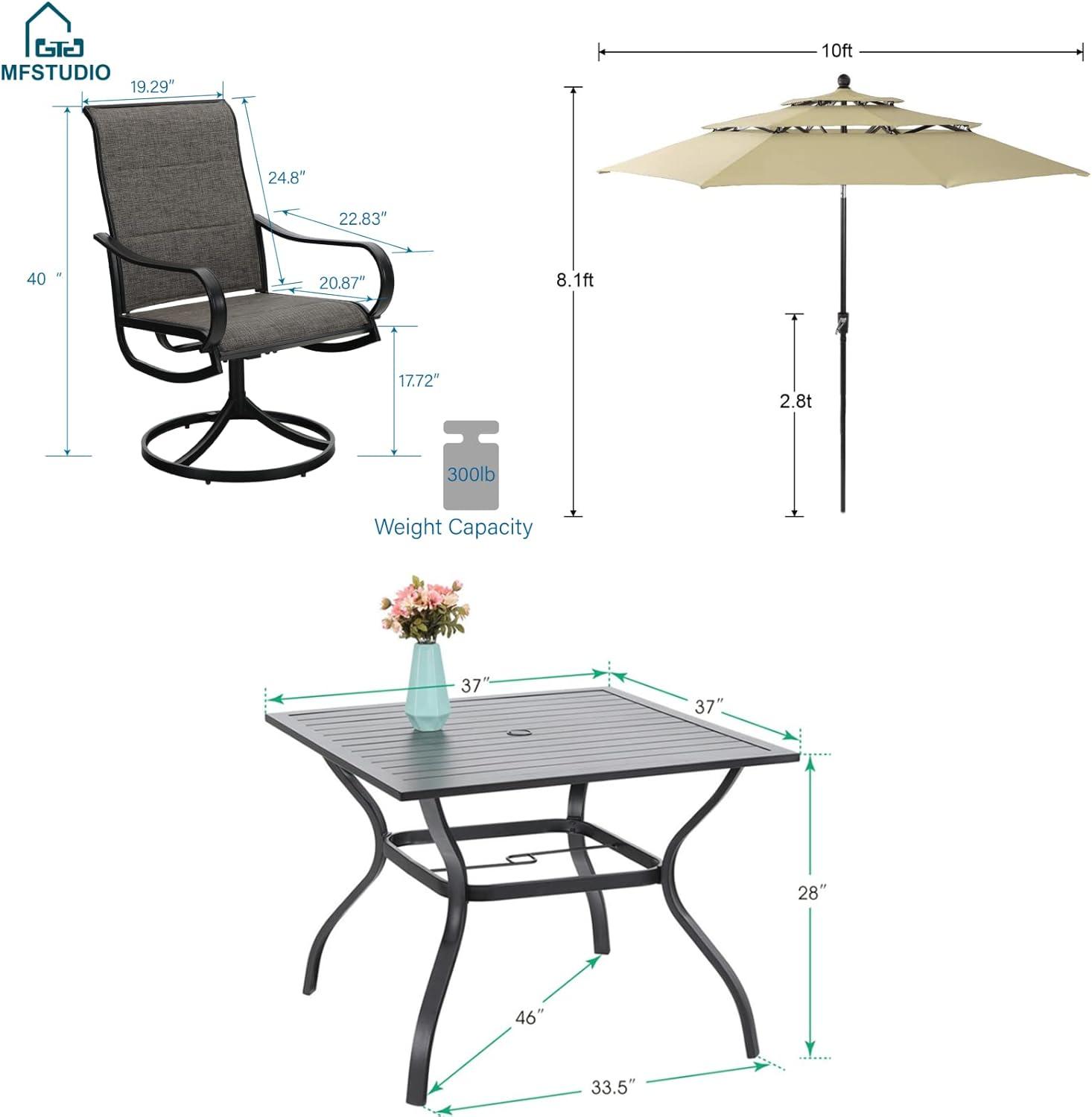Sunlight slices across the beige canopy and pools on the square tabletop, where the MFSTUDIO Patio Dining Set for 4 sits with a quietly grounded presence.Up close you feel the wrought‑iron frame’s visual weight even as the chairs swivel smoothly; the sling seats give a soft, springy push under your palm. The compact table keeps sightlines open on the deck while the umbrella throws a neat, dappled shade that softens the metal’s cool finish. You notice small tells of real use—the smooth finish, a tiny nick along the rim—so it reads like everyday furniture rather than a catalog prop.