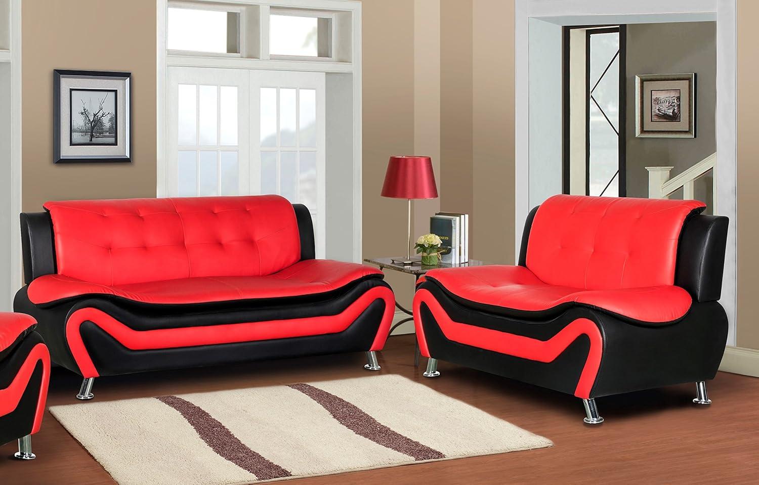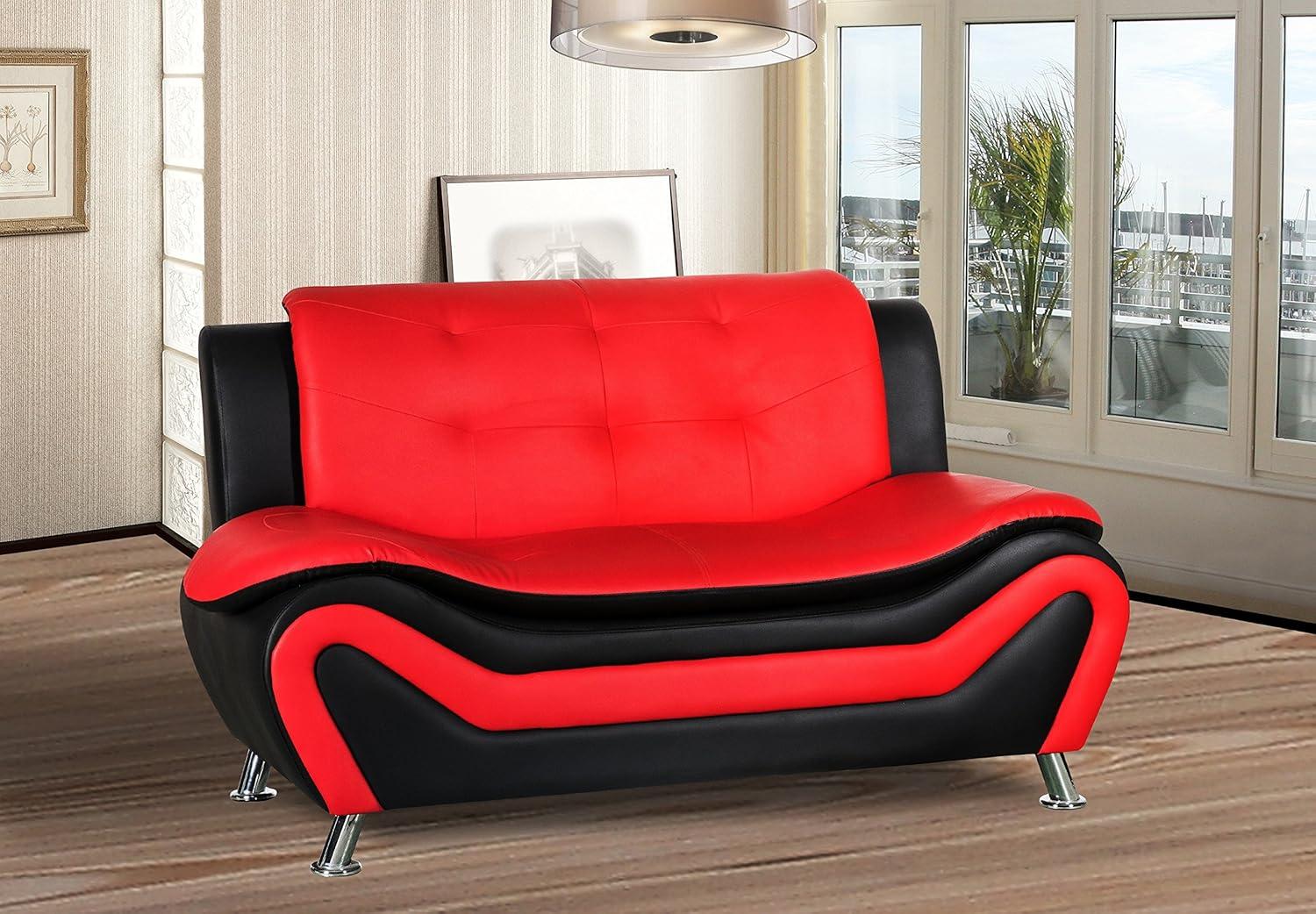 Embracing a mid-century modern vibe,this loveseat and sofa set instantly elevates our living space with its striking two-tone black and red leather air upholstery. The silky smooth texture combined with breathable materials offers not just comfort but also a sense of luxury that draws attention in any room. The distinct square tufting adds a refined detail, while the streamlined silhouette and gleaming metal legs contribute to a clean, refined aesthetic that balances form and function beautifully.