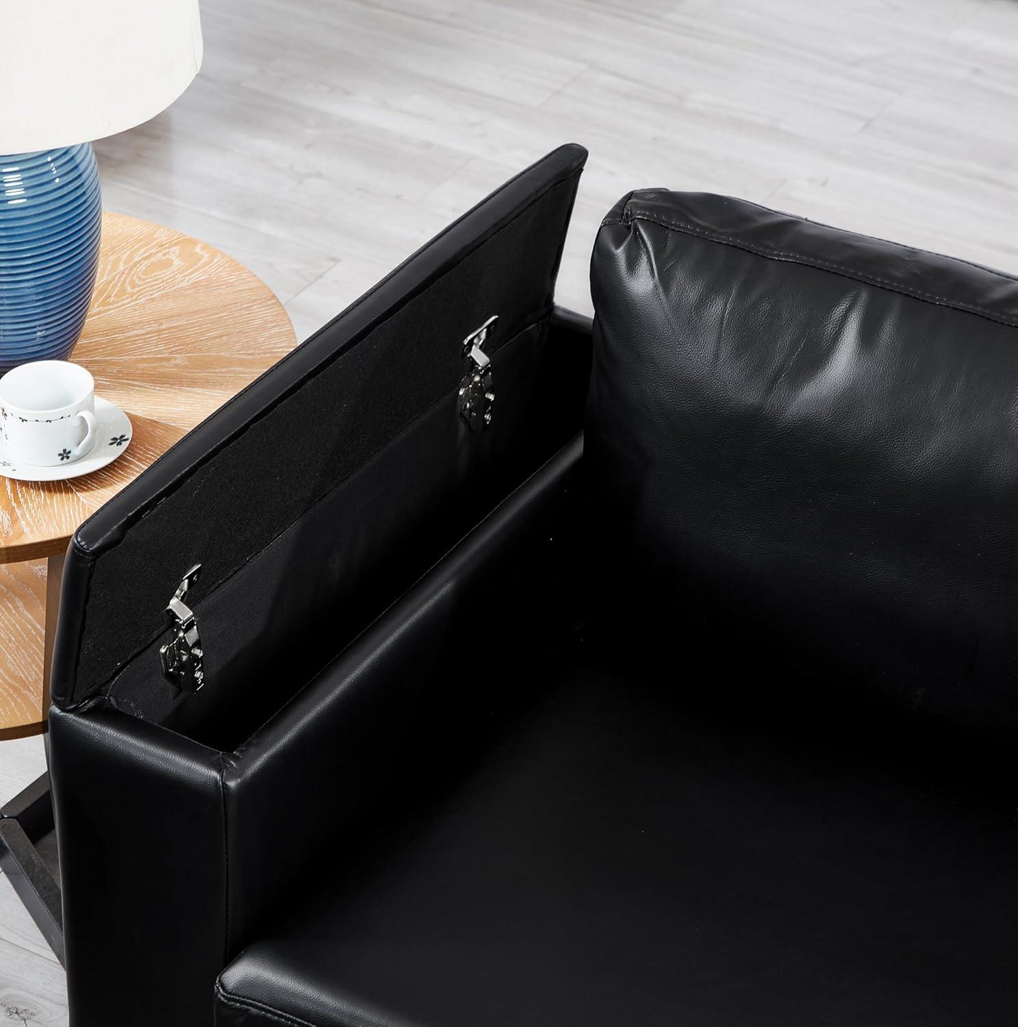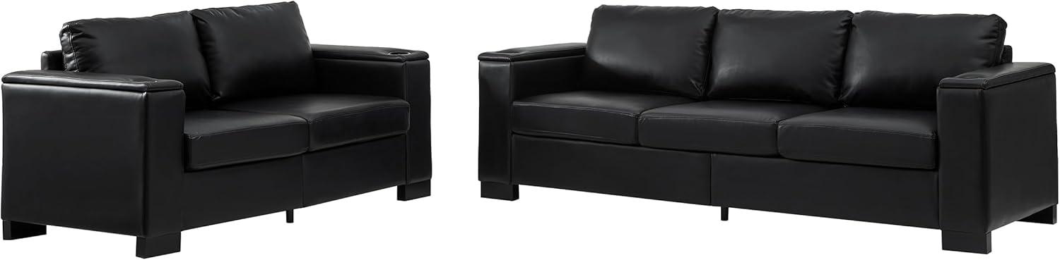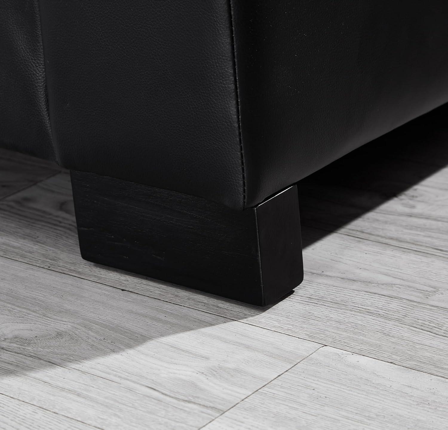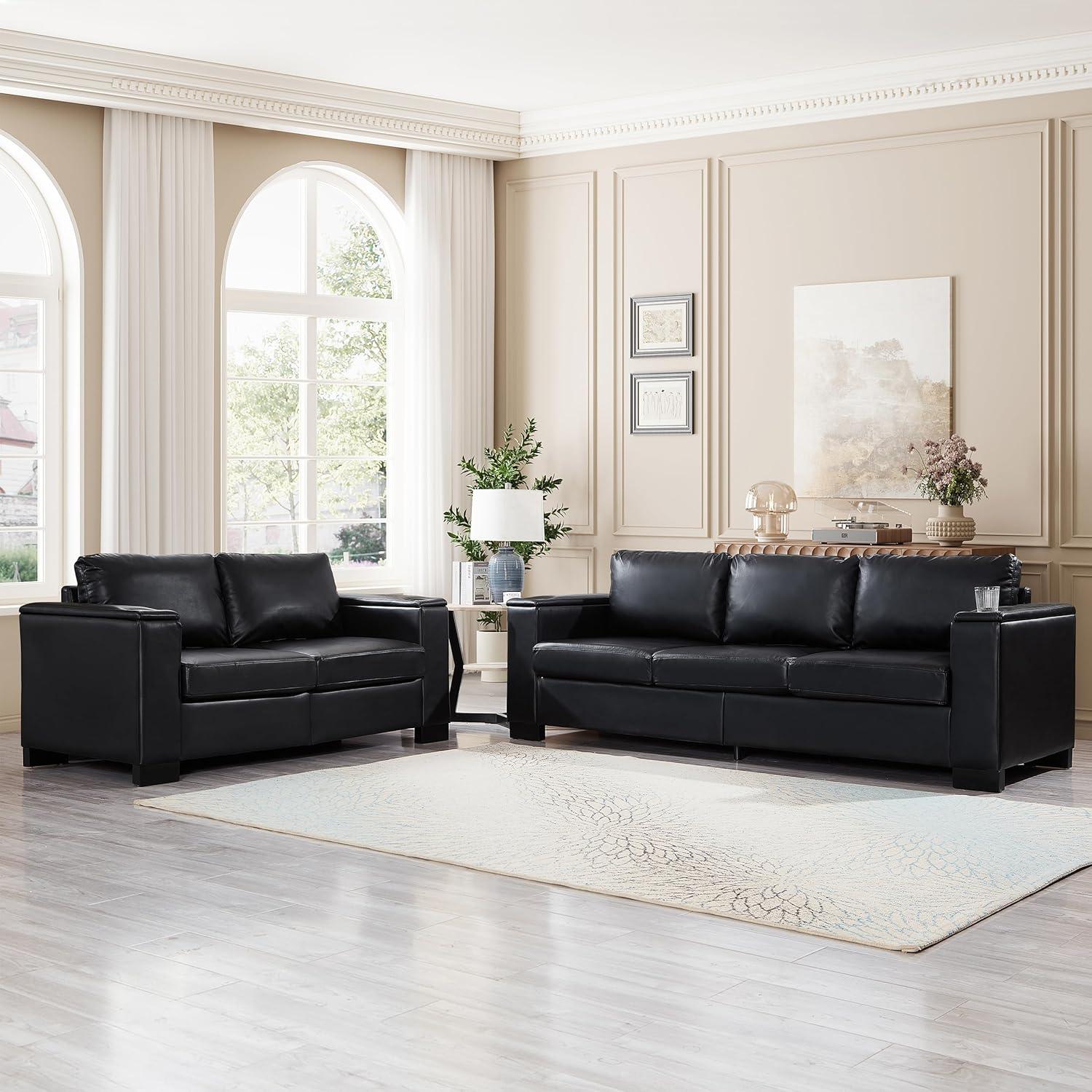 You’ll first notice how the square arm silhouette gives the seating a measured, architectural presence — the straight lines read like a frame around whatever happens on the cushions. In daylight those edges cast crisp shadows across the seat tops; under lamp light the black PU takes on a soft sheen that changes with movement, so seams and stitched joins catch and release highlights as you settle in and smooth the surface. Small, habitual acts — nudging a cushion back into place, running a hand along an armrest — make the geometry feel lived-in rather than purely formal.