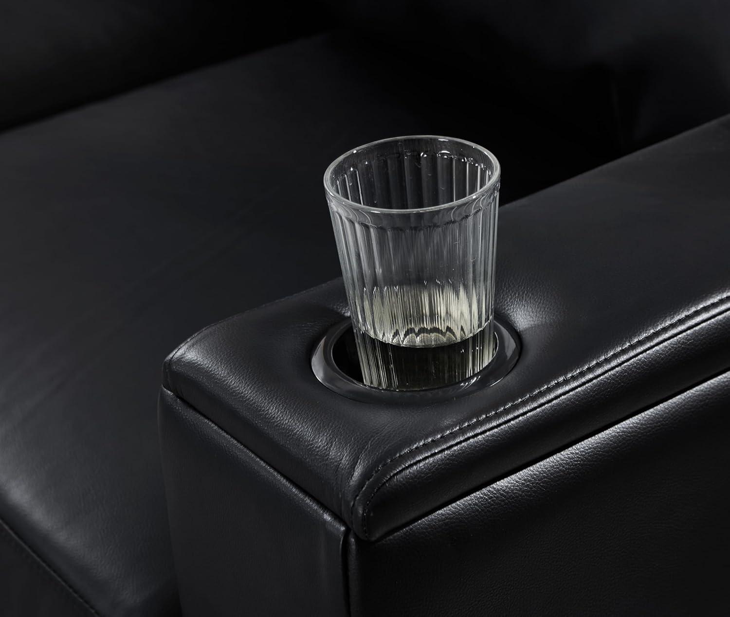 The cup-holder console interrupts that rectangular run of arms and becomes a small visual and functional focal point: when empty it reads as a purposeful break in the line, and when filled it collects the traces of use that mark a room’s rhythm. In most rooms the deep black tends to ground other colors, pulling attention inward; in lower light it can recede, letting lamps and textiles take over, while in bright settings it reflects enough to show fingerprints or crumbs more readily. These are the ways the silhouette, upholstery and console work together to shape the room’s atmosphere as you use it, moment to moment.