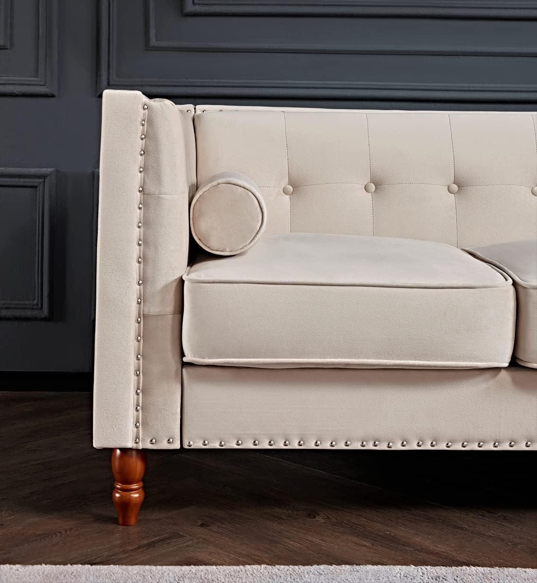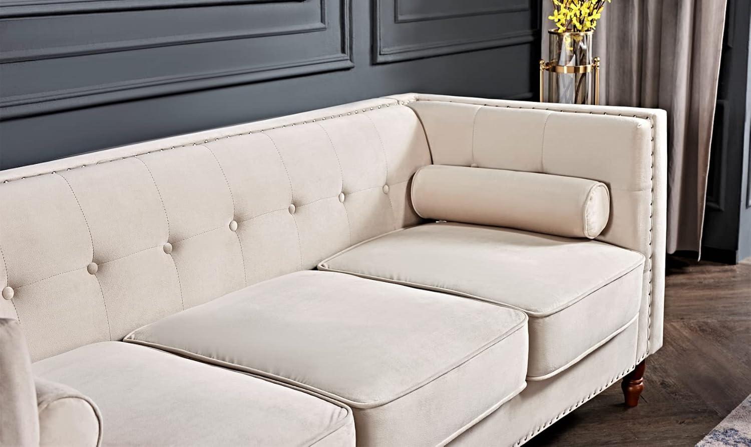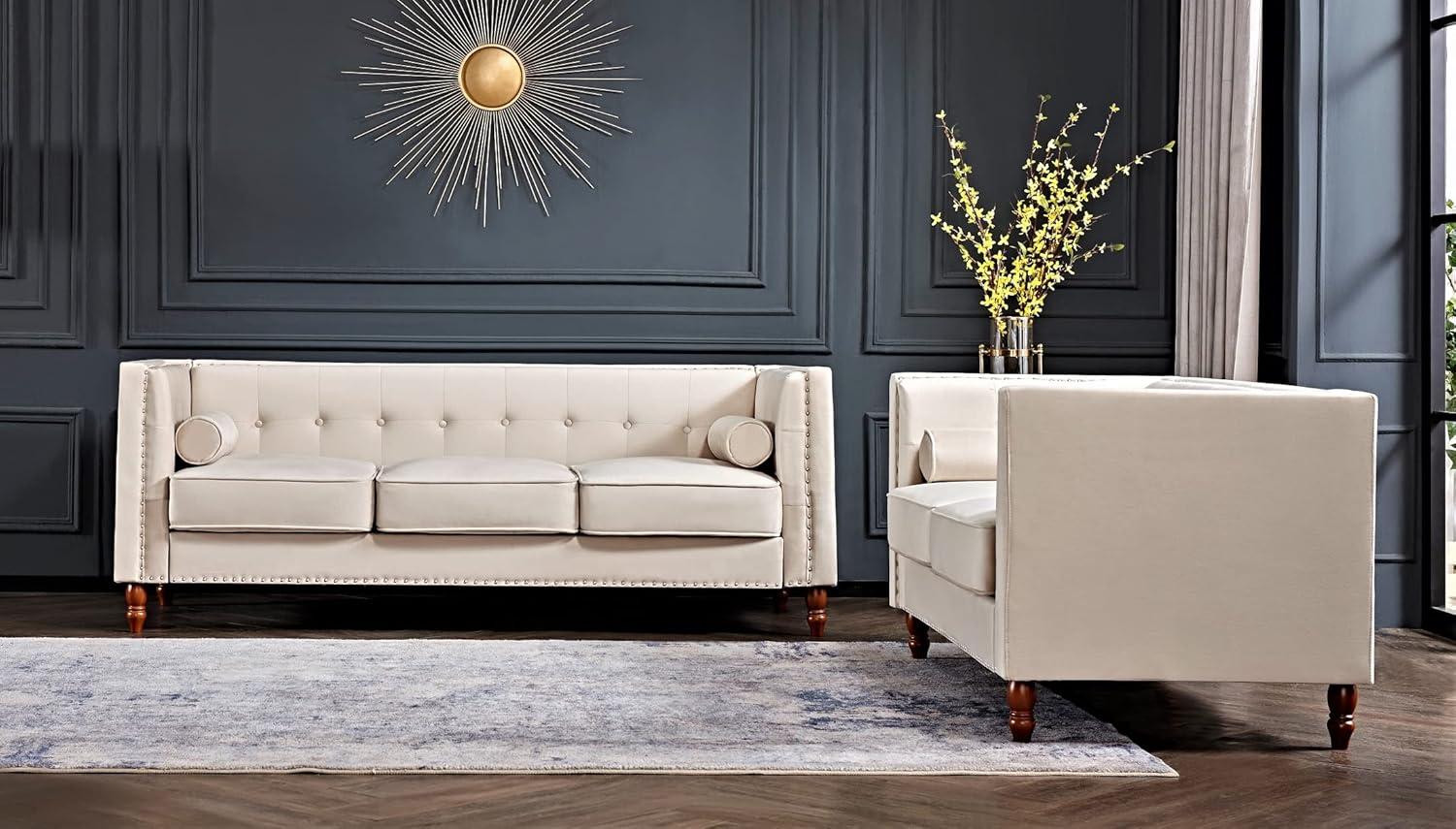 with its classic low-back silhouette and rich velvet upholstery, this set gracefully adapts to a wide range of interior aesthetics. Whether we place these couches in a modern living room or a more traditional bedroom nook, their deep button tufting and squared arms bring a refined, yet cozy vibe. The neutral ivory shade acts as a perfect canvas that complements bold accent colors or more subdued palettes. Its clean lines and sturdy wooden turned legs make it equally fitting in a contemporary office or a stylish apartment, making it a truly multifunctional set. The loose seat cushions further enhance versatility, giving us the freedom to maintain and refresh the look with ease.